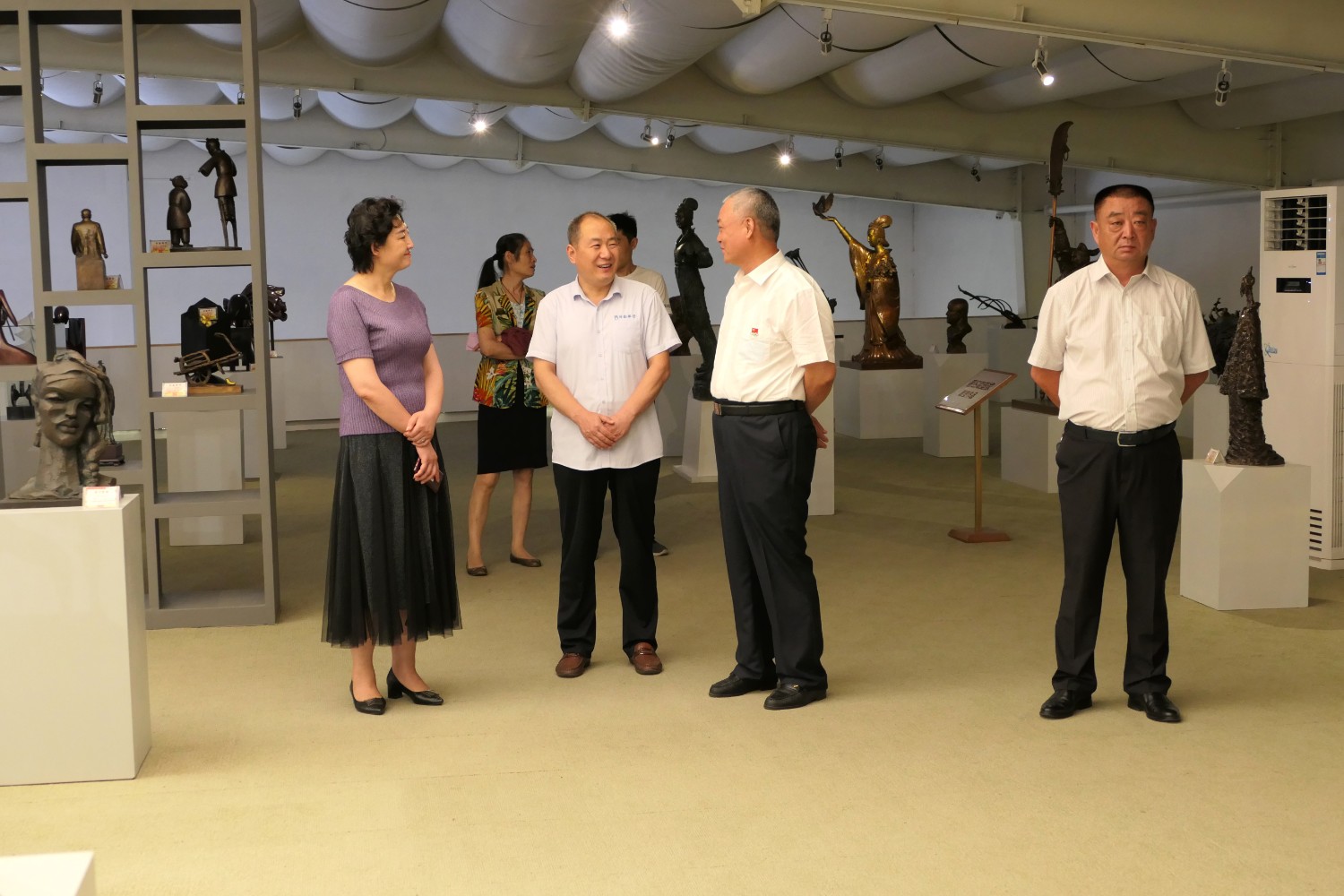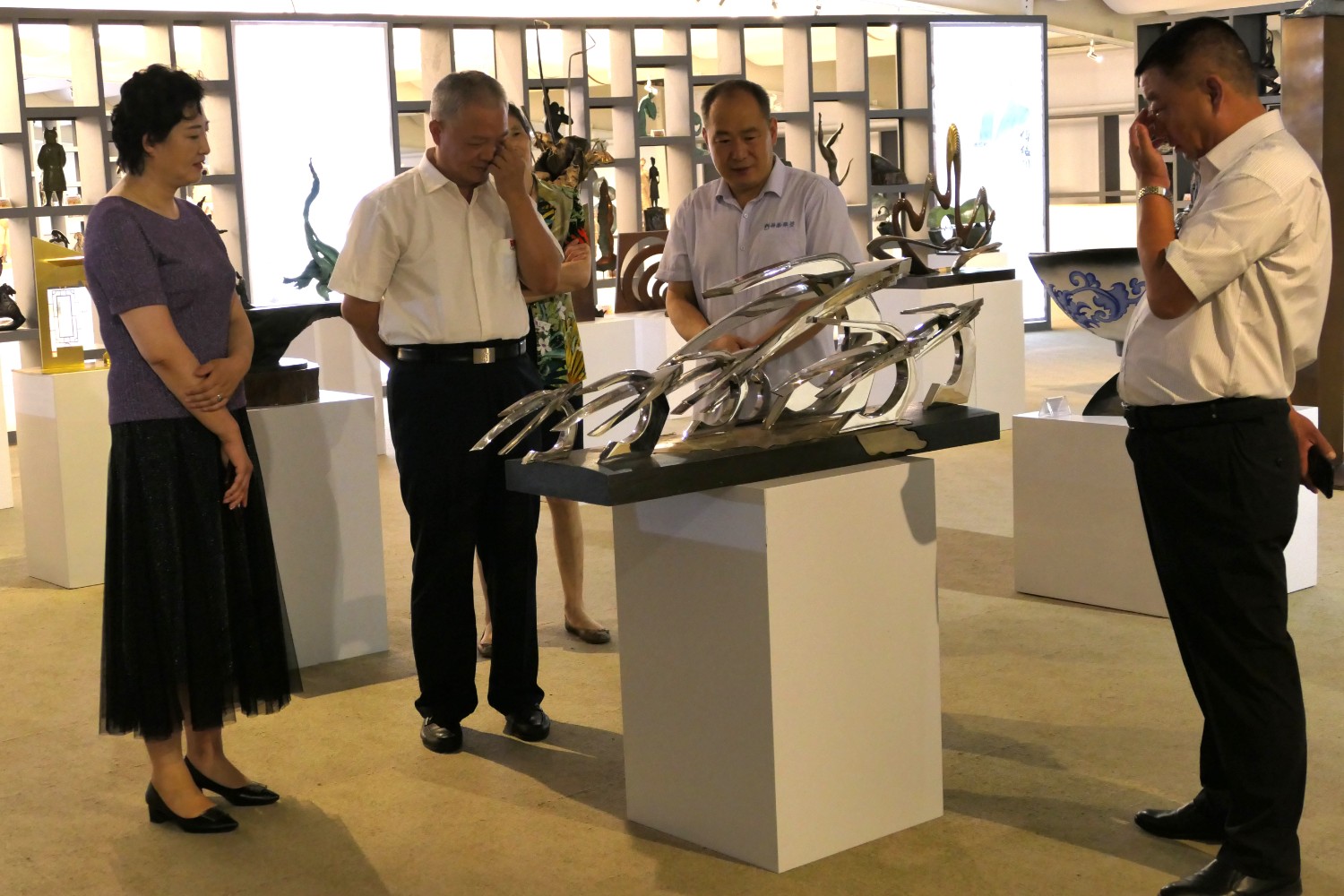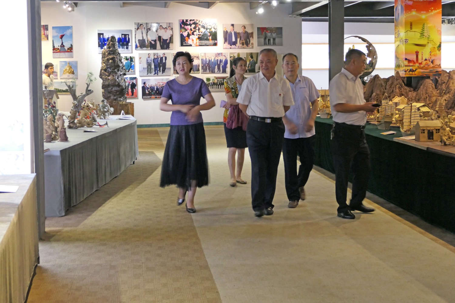 2020年8月1日临朐县文联主席李咏梅陪同山东省军分区政委南兵军来华艺参观指导。