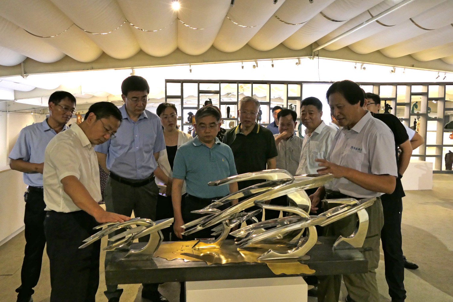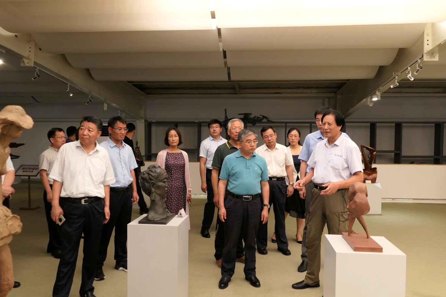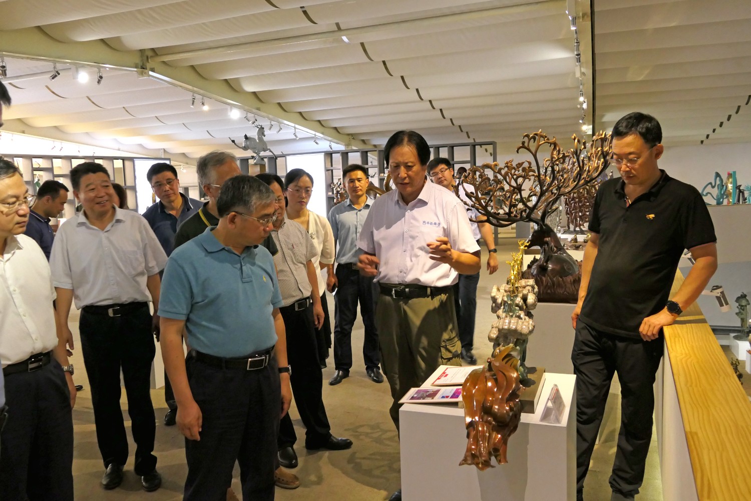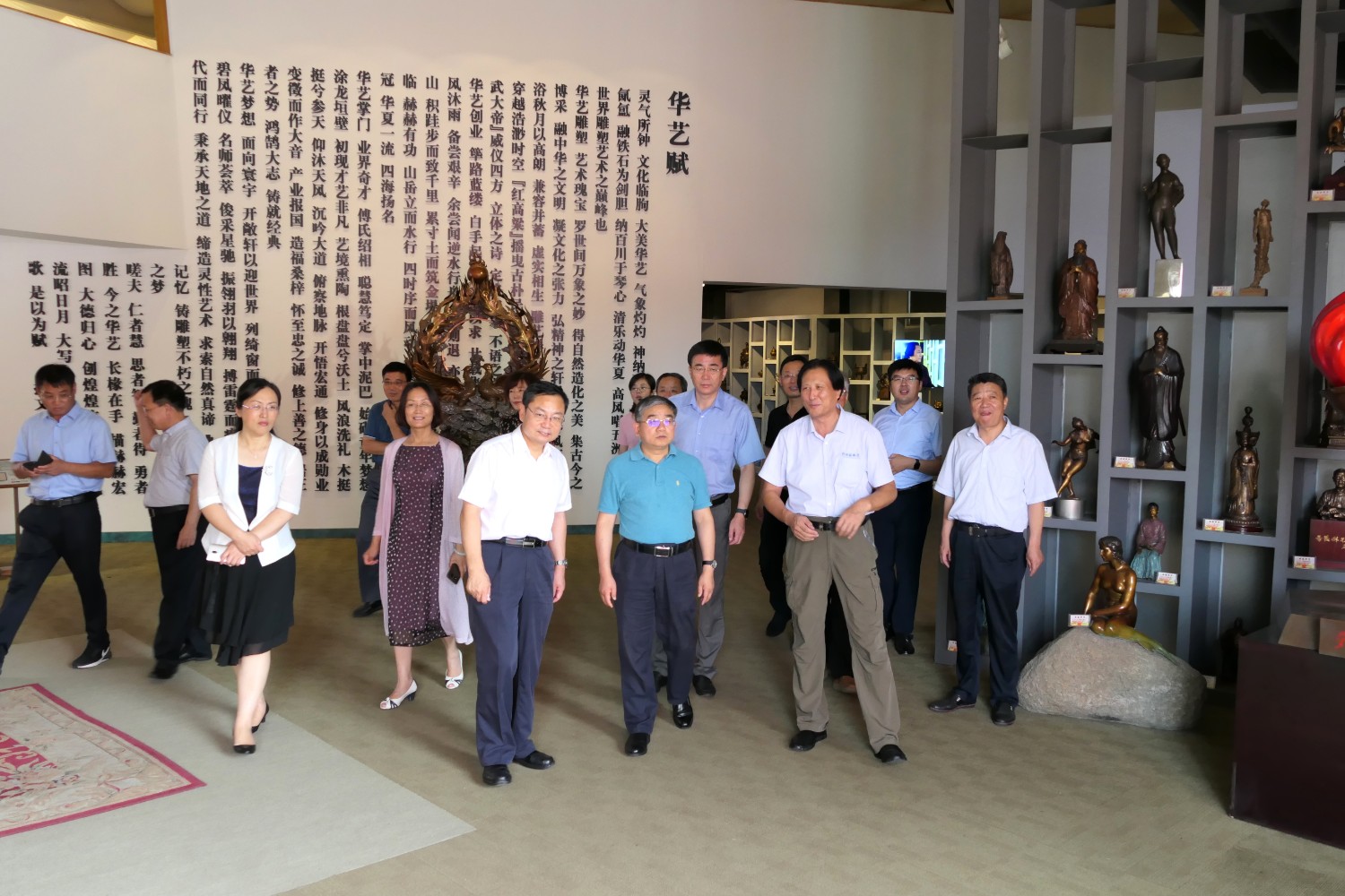 2020年8月2日,青岛大学党委书记胡金焱一行,在临朐县人民政府田元君县长的陪同来华艺参观指导。傅绍相介绍雕塑艺术。