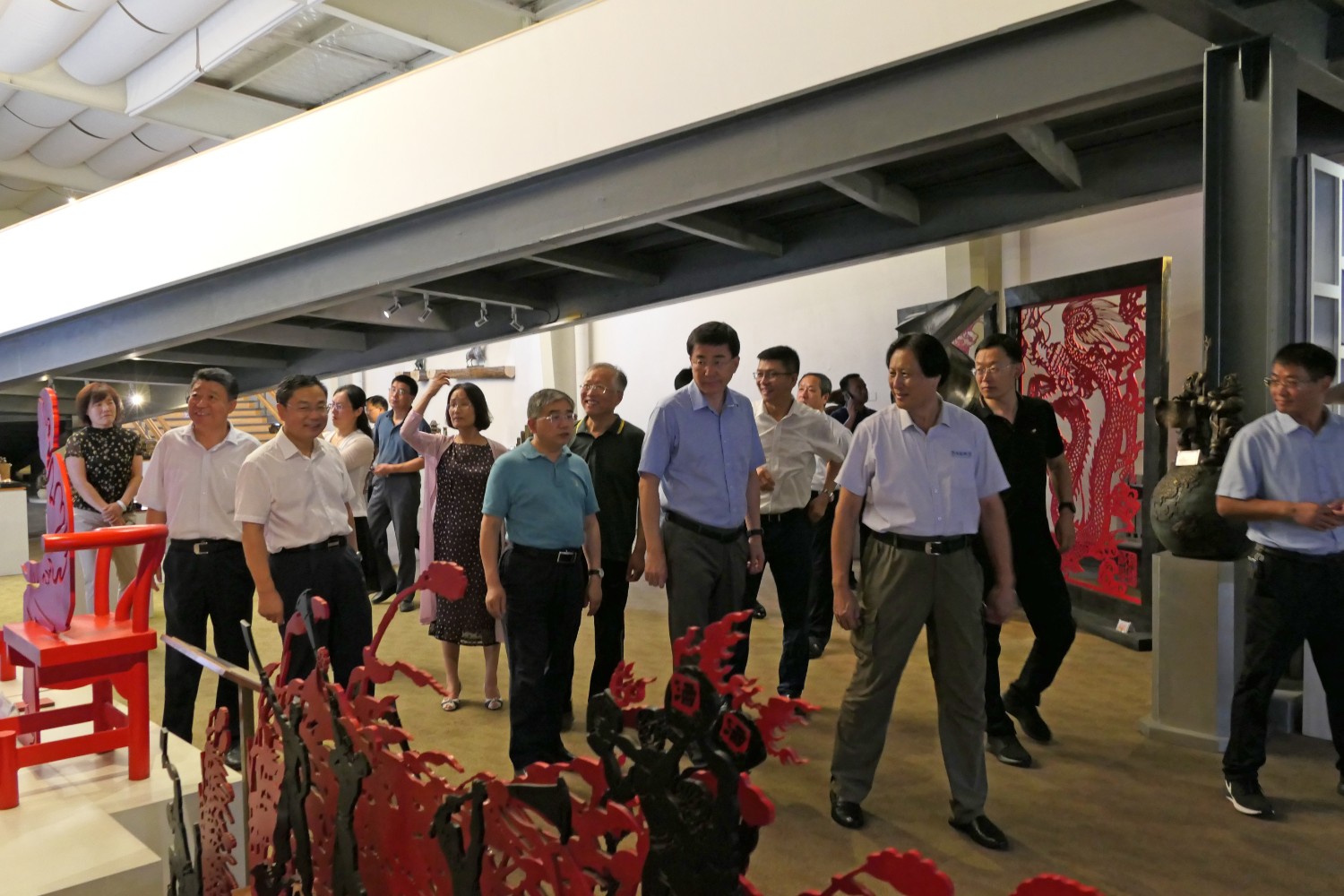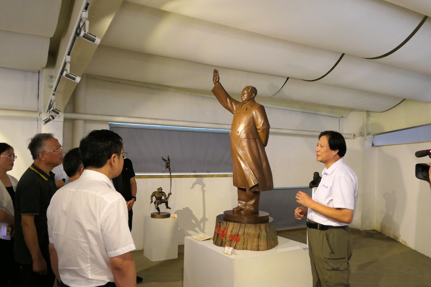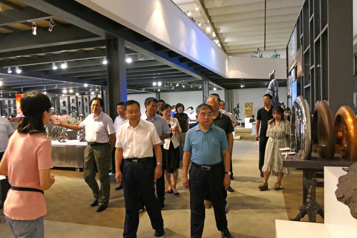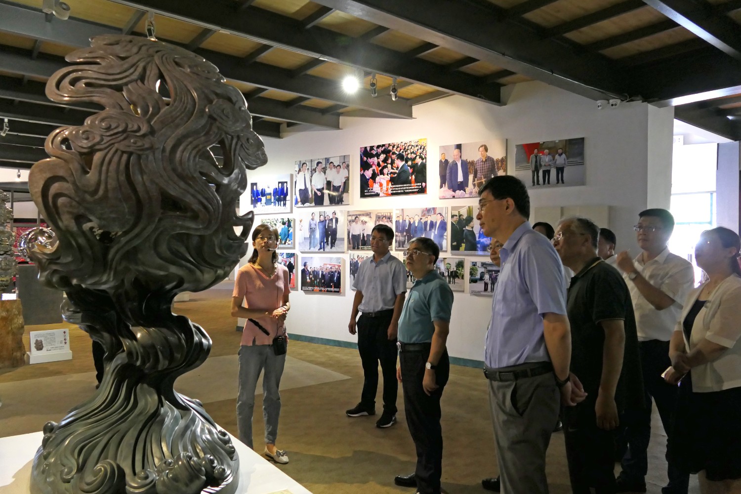 2020年8月2日,青岛大学党委书记胡金焱一行,在临朐县人民政府田元君县长的陪同来华艺参观指导。傅绍相介绍雕塑艺术。