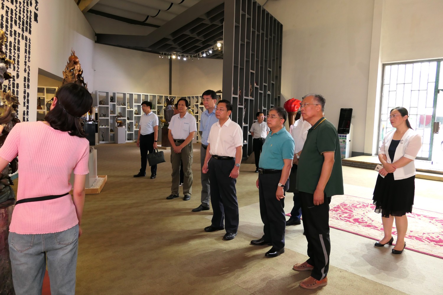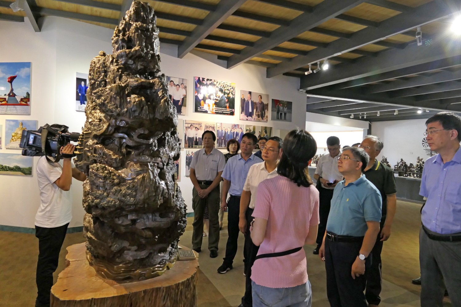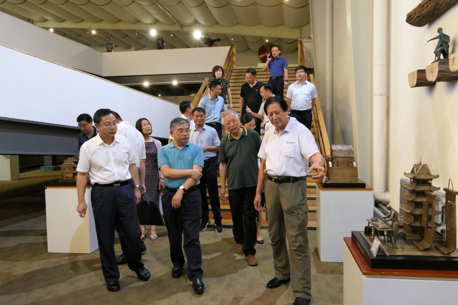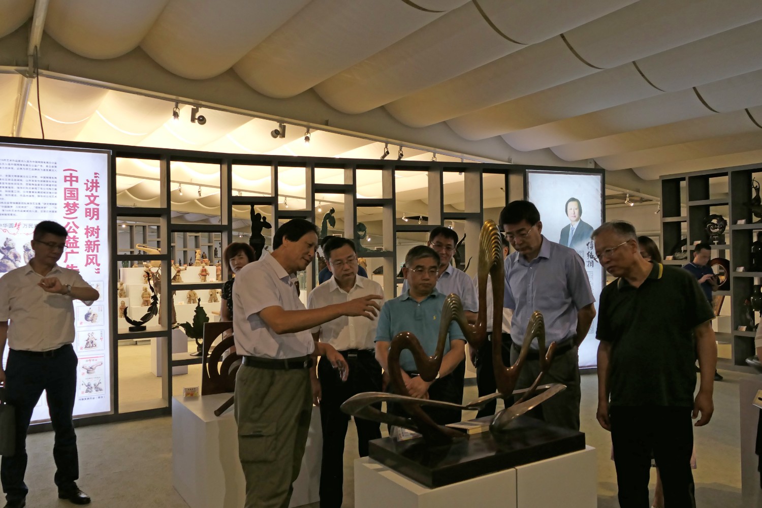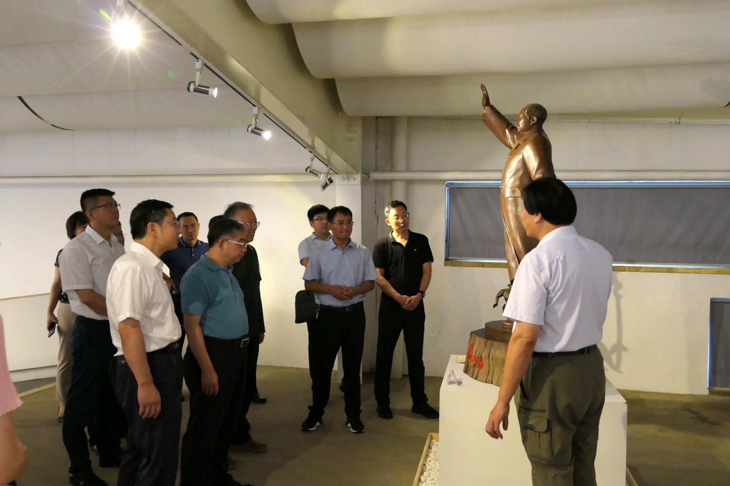 2020年8月2日,青岛大学党委书记胡金焱一行,在临朐县人民政府田元君县长的陪同来华艺参观指导。傅绍相介绍雕塑艺术。