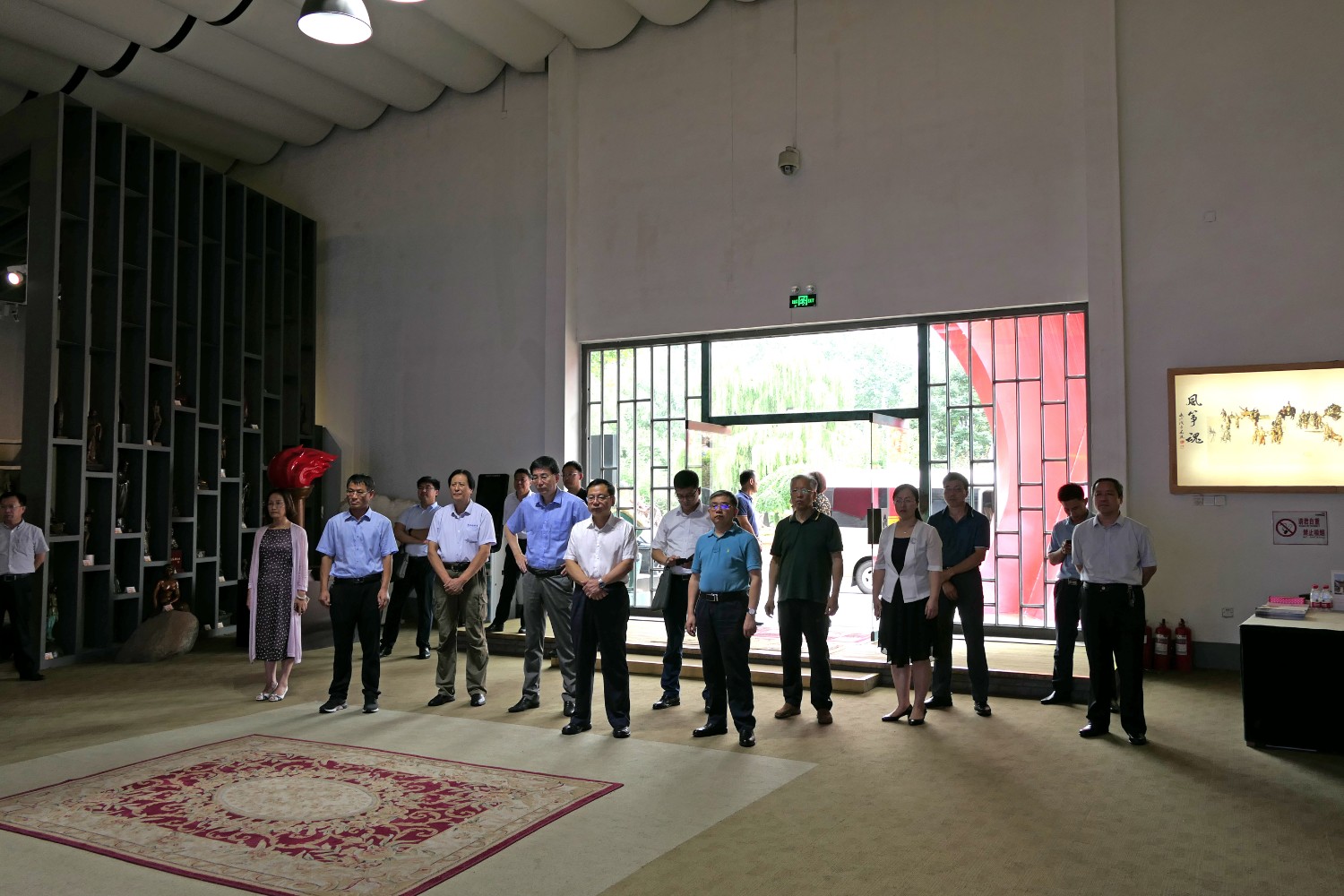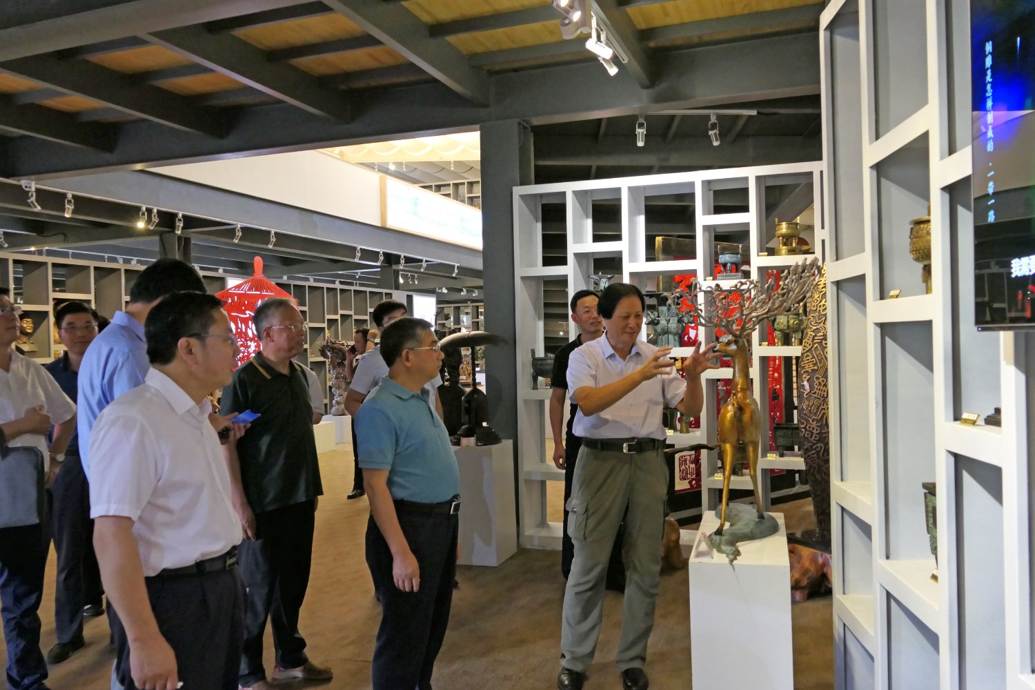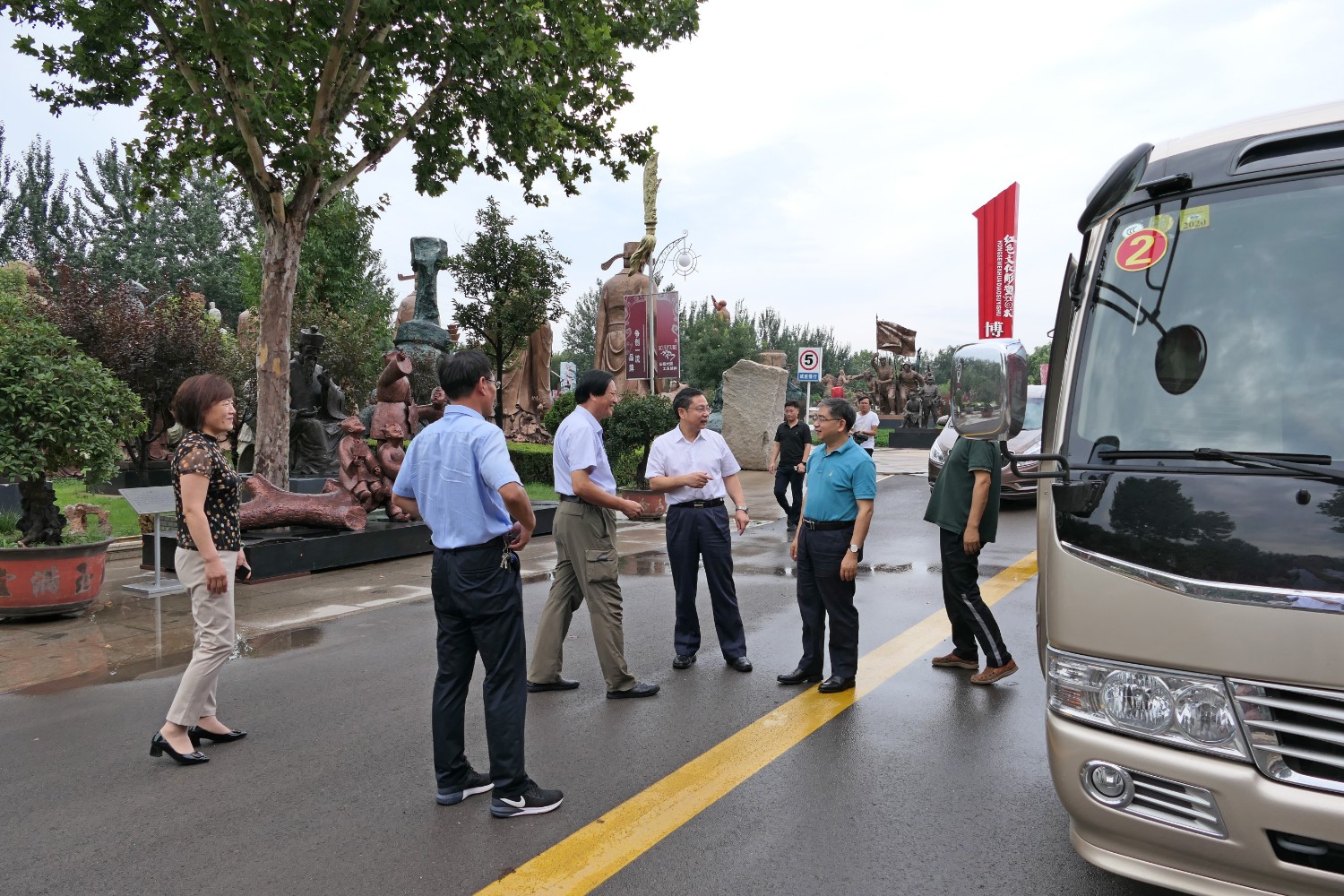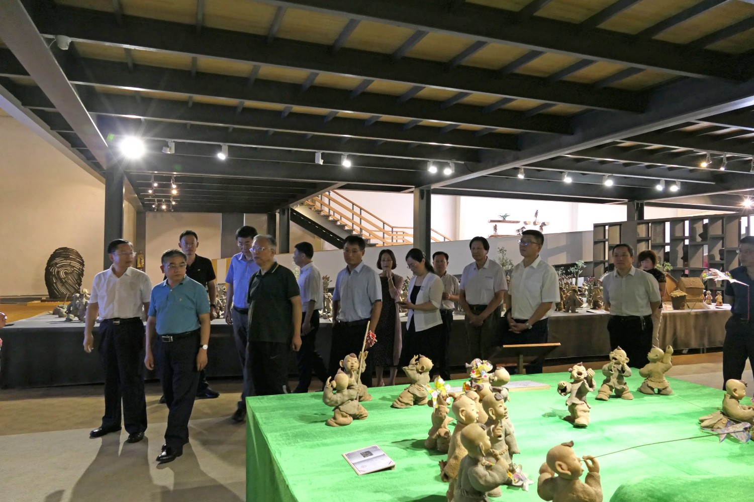 2020年8月2日,青岛大学党委书记胡金焱一行,在临朐县人民政府田元君县长的陪同来华艺参观指导。傅绍相介绍雕塑艺术。