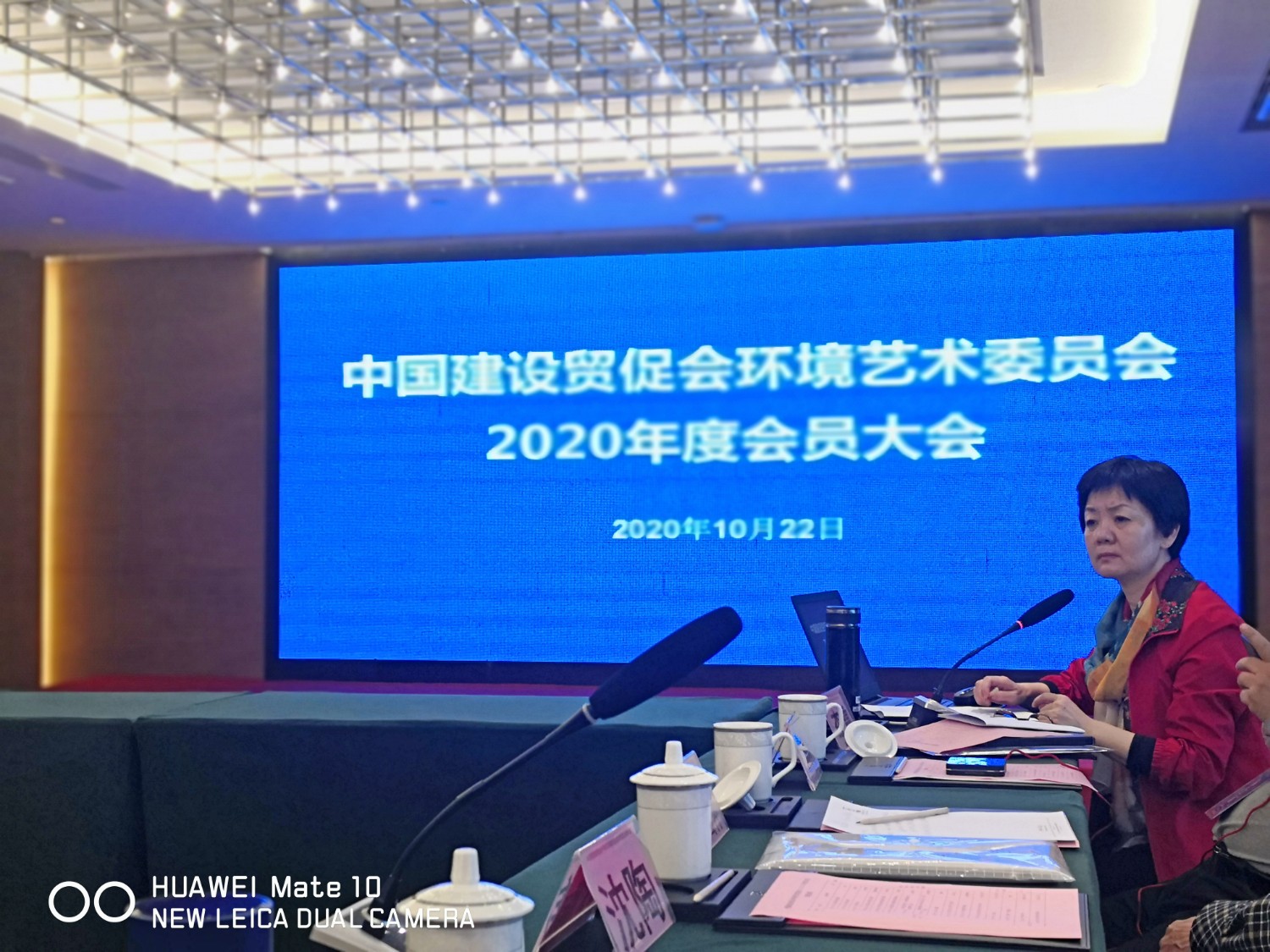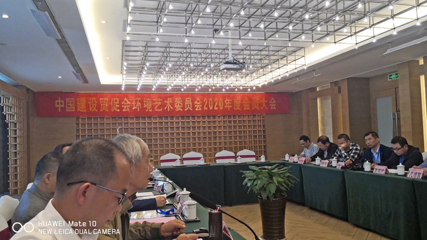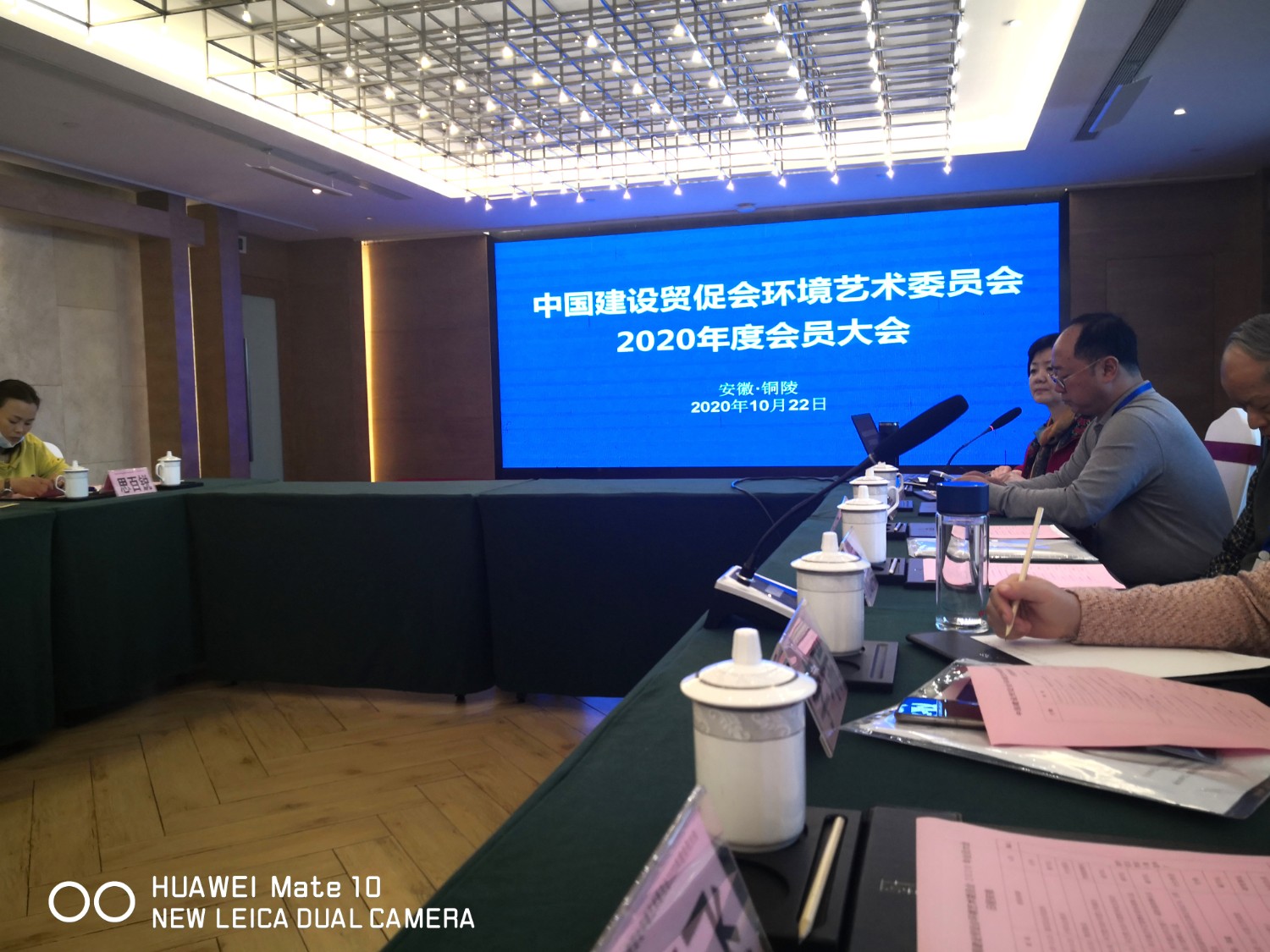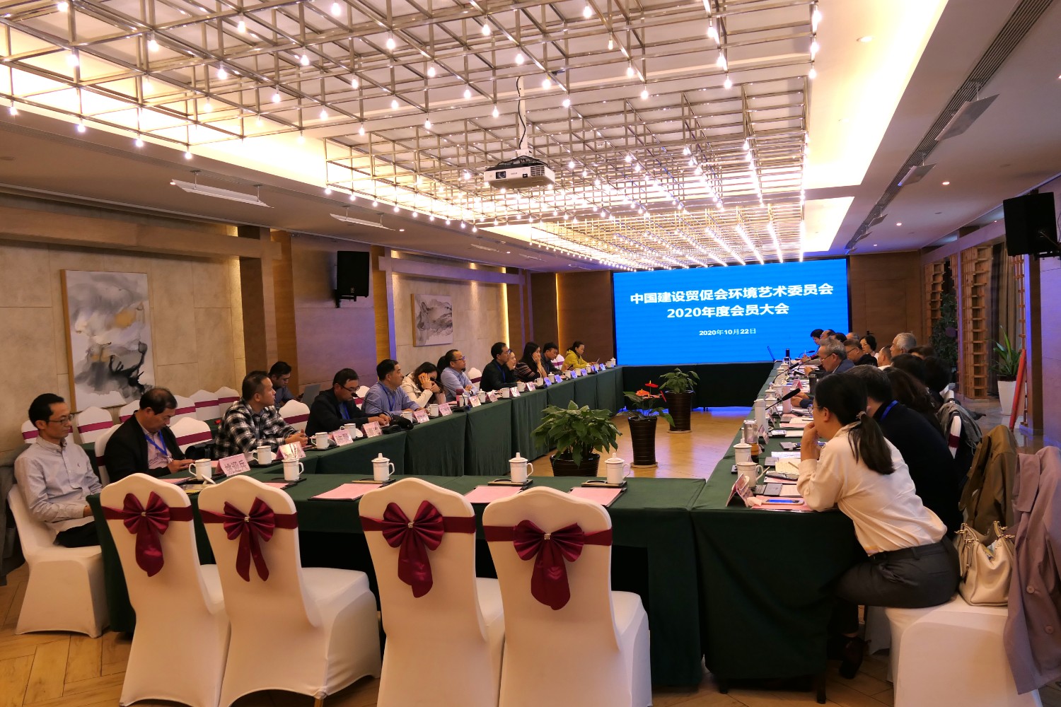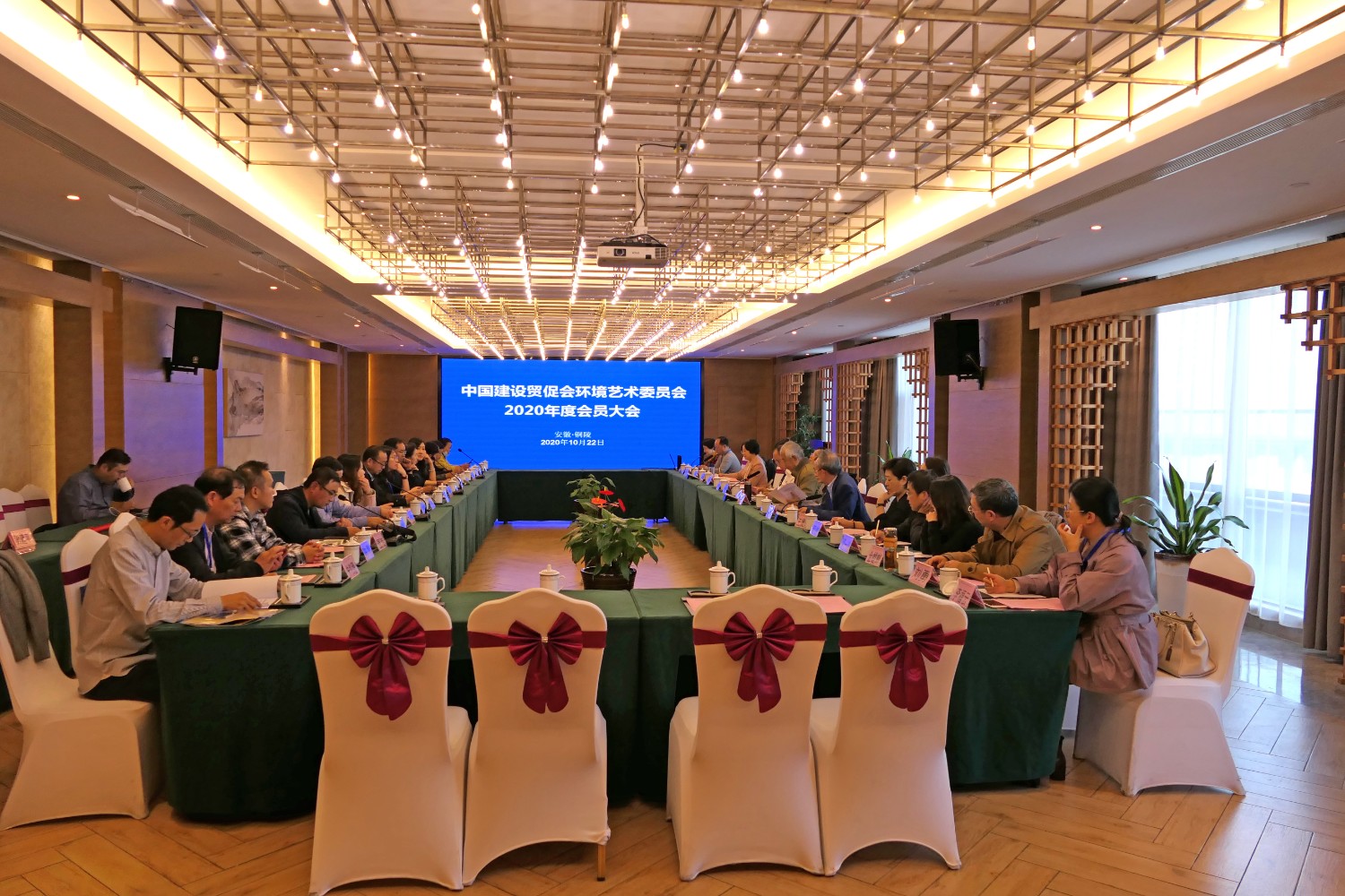 2020年10月22日,中国建设贸促会环境艺术委员会2020年度会员大会在铜陵天玑酒店隆重召开,李霞主任主持会议,各会员代表踊跃发言,会议气氛热烈,晚宴傅绍相展示了书法作品《聚艺铜陵》,谭海先生即兴演唱歌曲,黄春勇先生演奏了管乐“尺八”,会议在团结祥和的氛围中圆满结束。