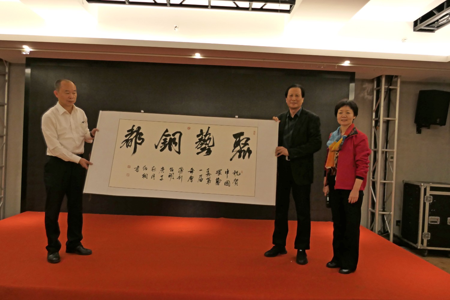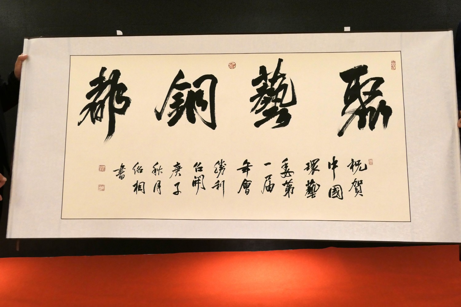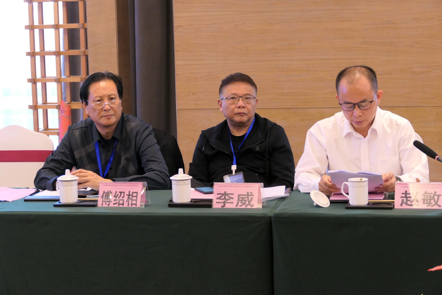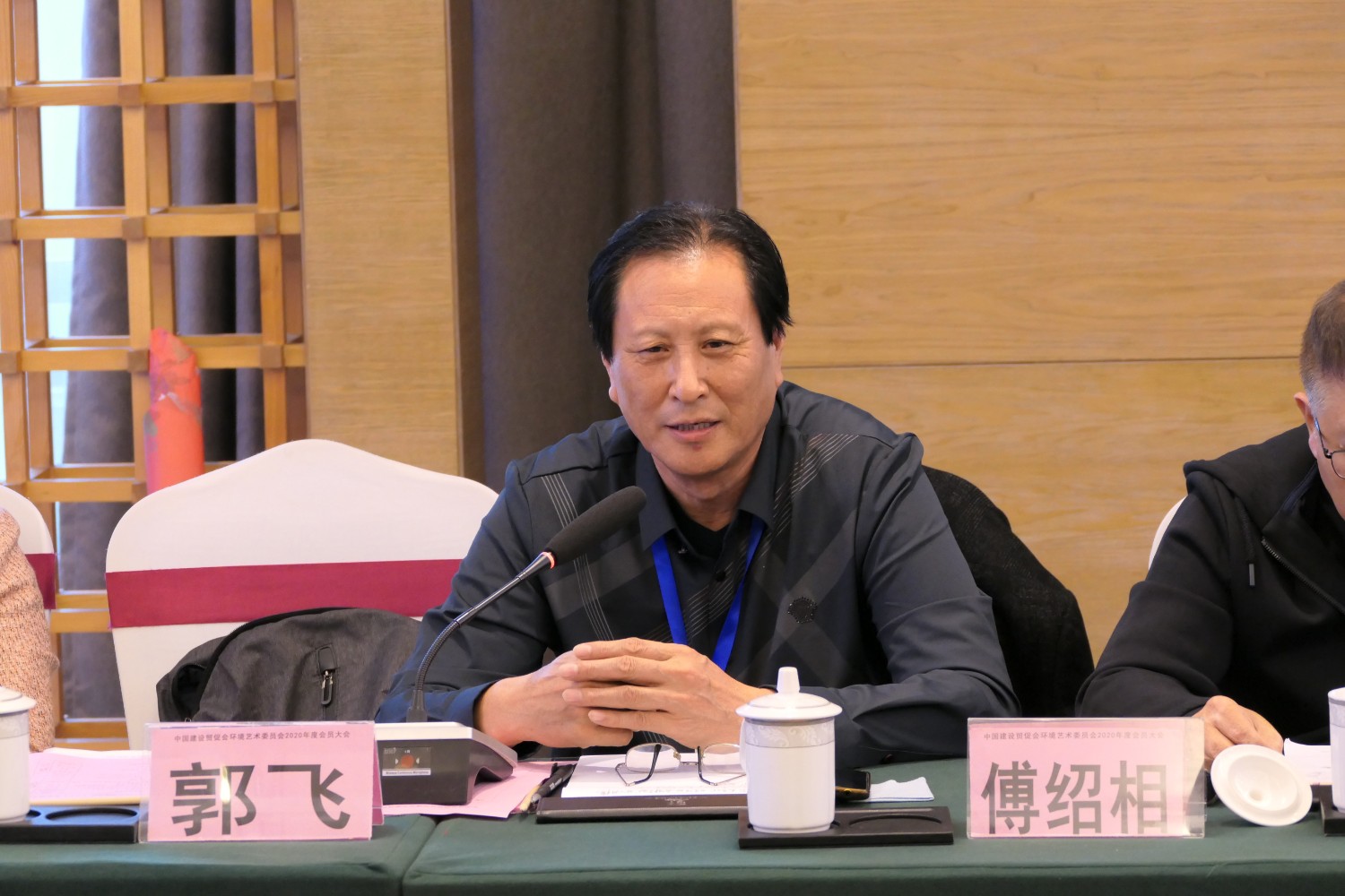 2020年10月22日,中国建设贸促会环境艺术委员会2020年度会员大会在铜陵天玑酒店隆重召开,李霞主任主持会议,各会员代表踊跃发言,会议气氛热烈,晚宴傅绍相展示了书法作品《聚艺铜陵》,谭海先生即兴演唱歌曲,黄春勇先生演奏了管乐“尺八”,会议在团结祥和的氛围中圆满结束。