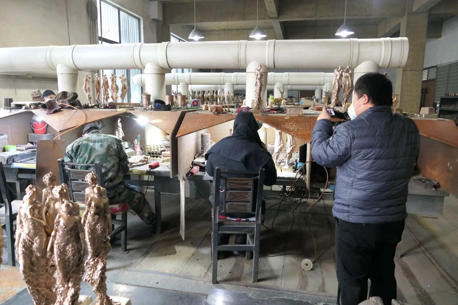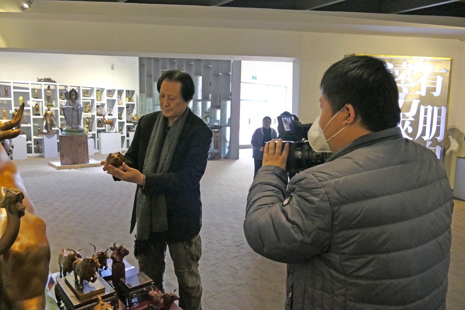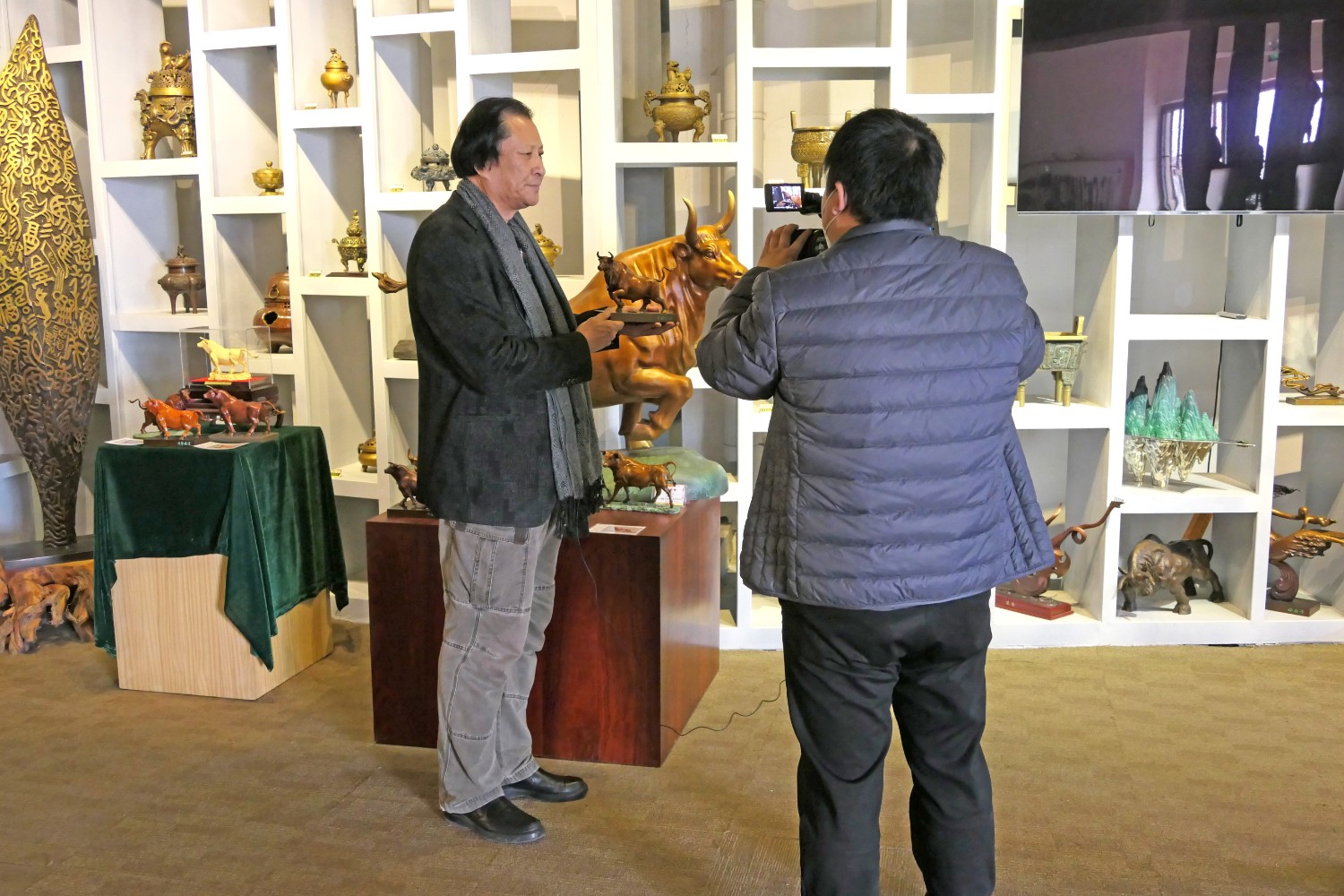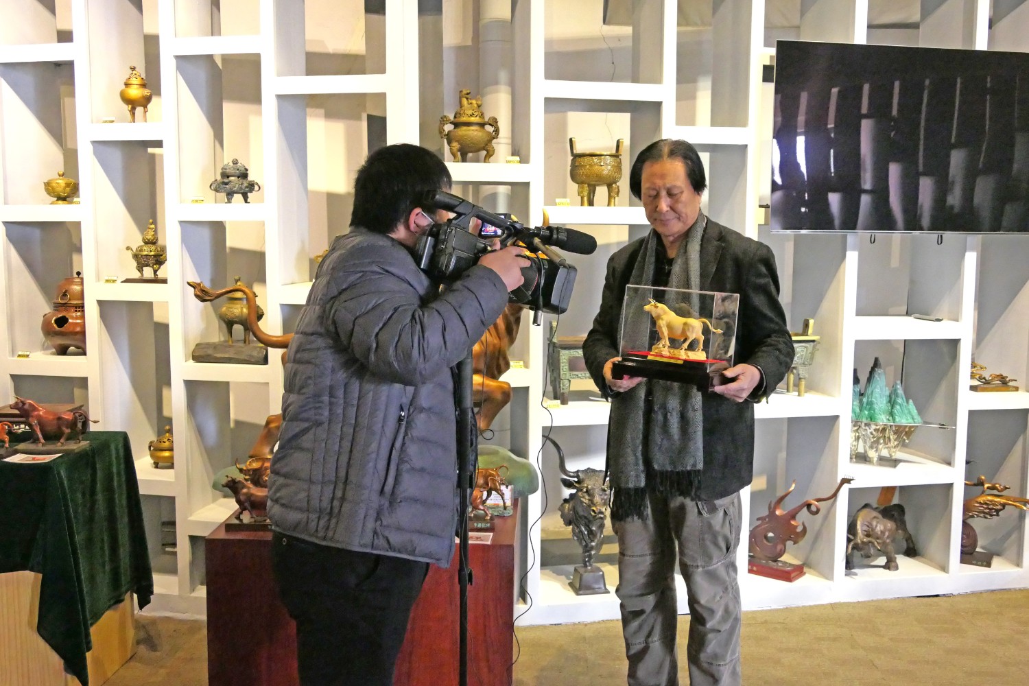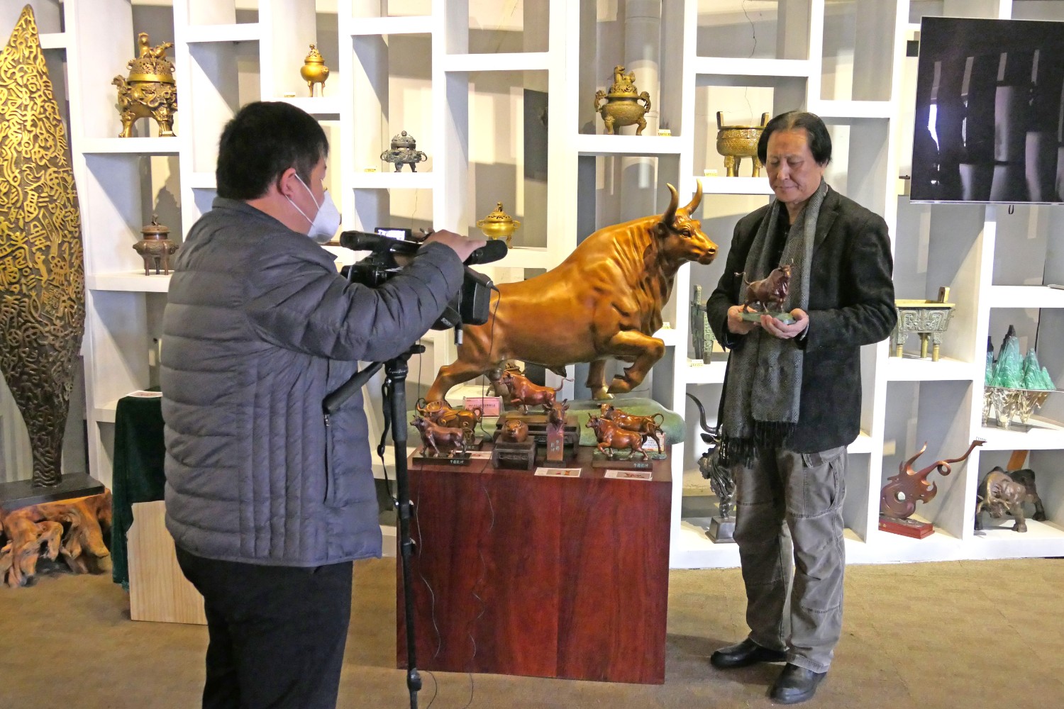 2021年1月27日,临朐电视台记者王虎来华艺雕塑拍摄生肖辛丑牛年青铜工艺品新闻报道,傅绍相介绍牛年贺岁青铜礼品。
