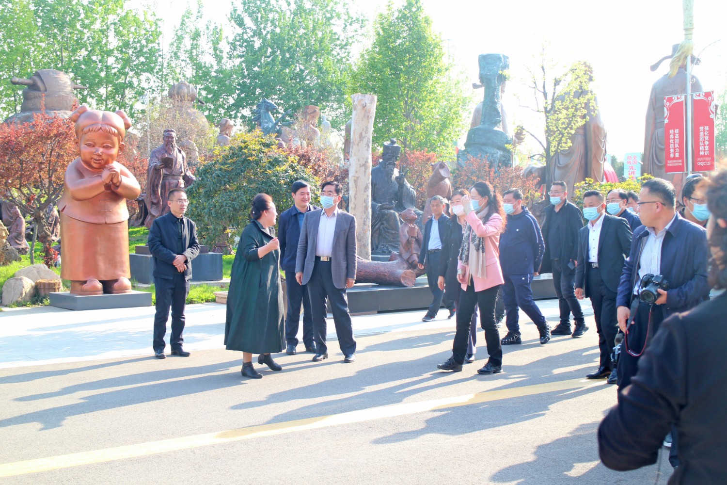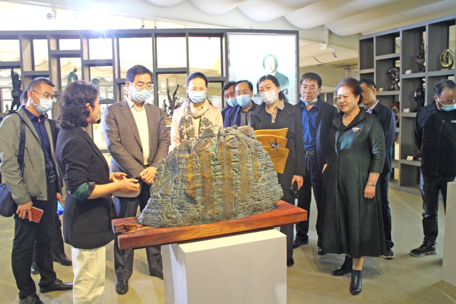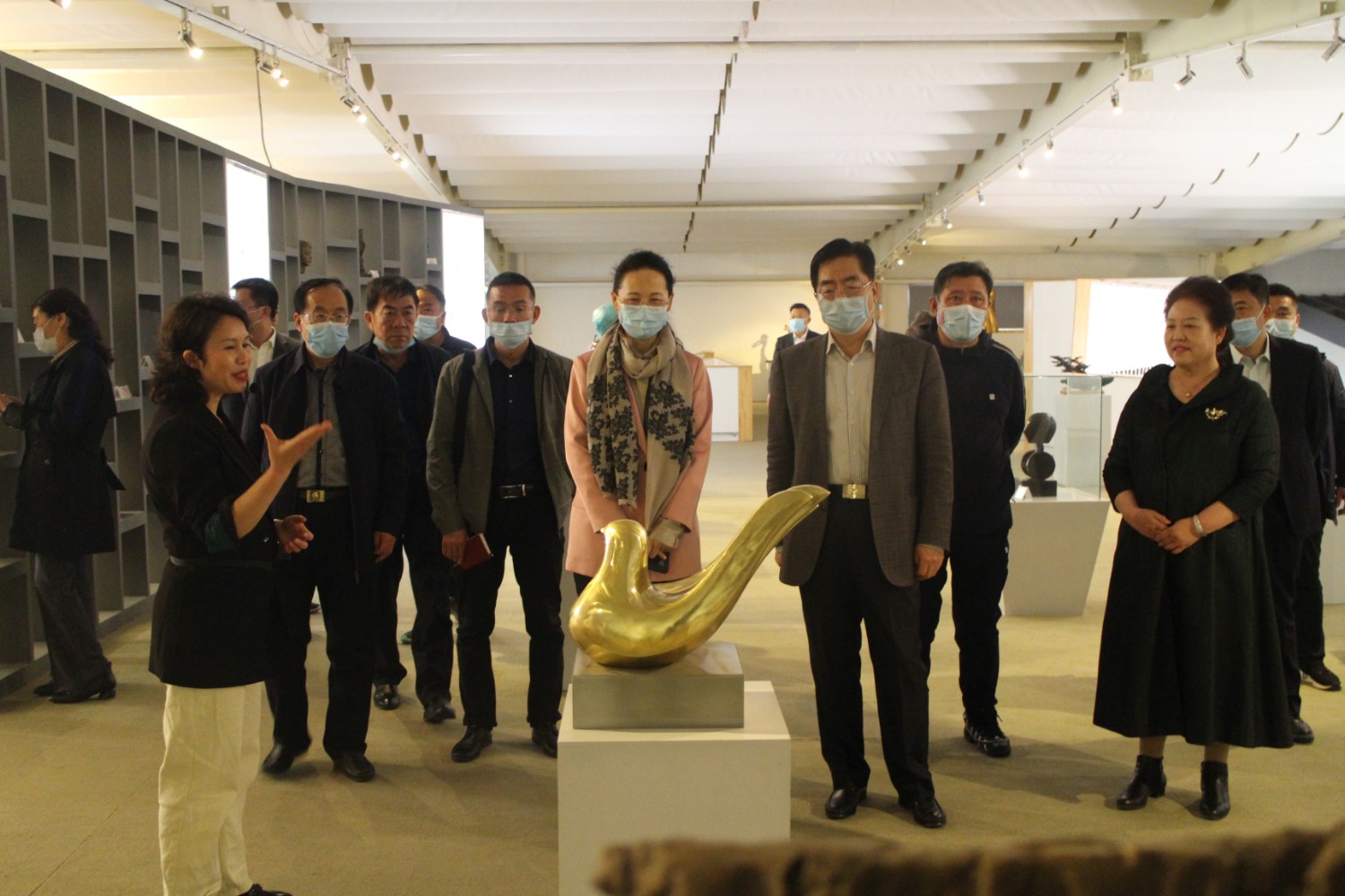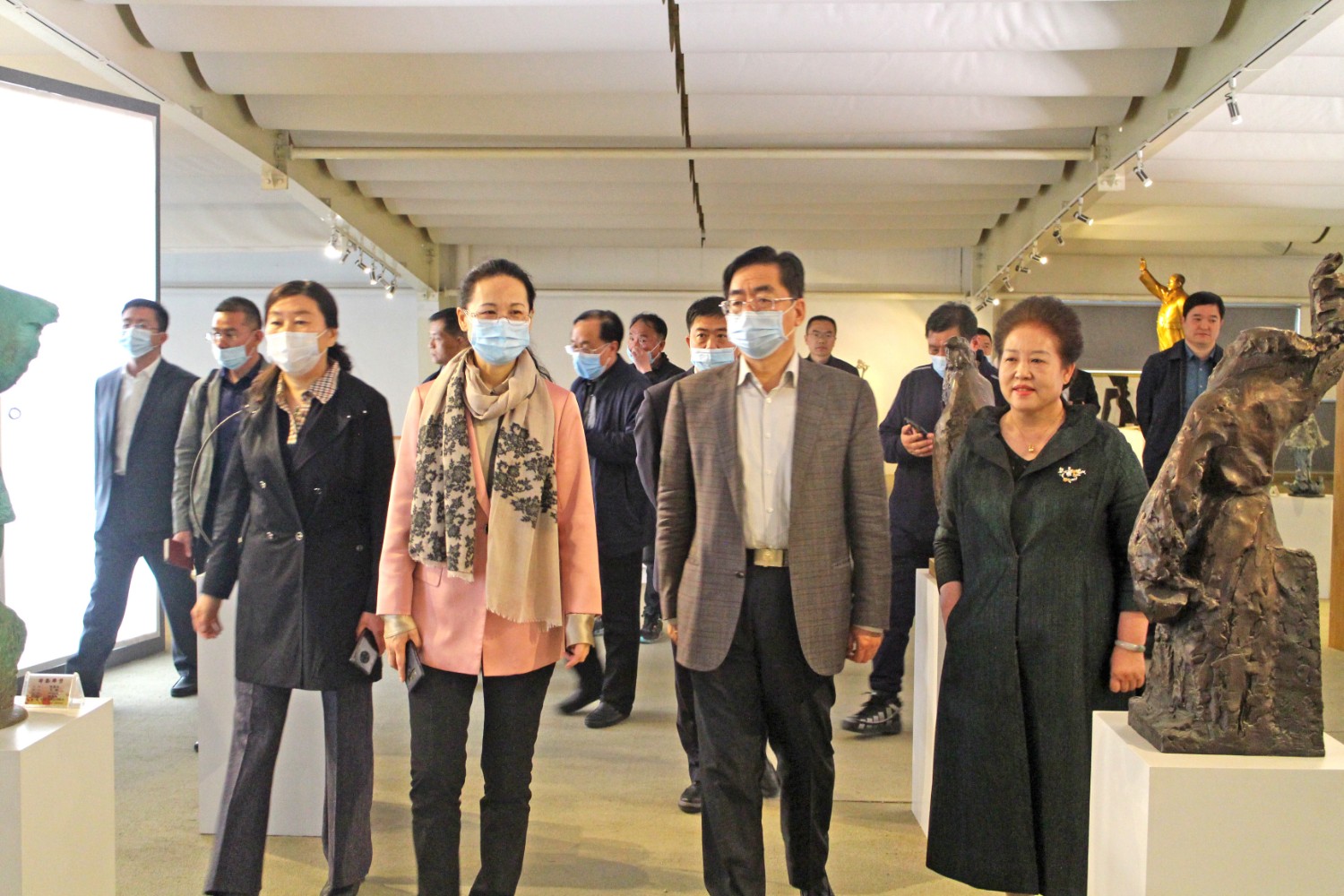 2021年4月14日,民盟内蒙古自治区委员会副主委、包头市政协副主席贺俊一行,在潍坊市政协副主席、九三学社潍坊主委李传恒的陪同下来临朐县参观考察,临朐县政协主席赵永娟、副主席白文玉陪同客人莅临华艺雕塑视察指导,华艺总经理谭宏伟介绍雕塑艺术。