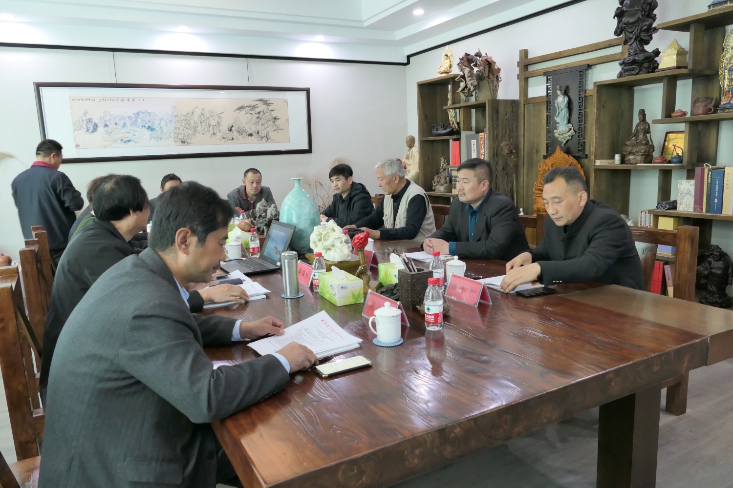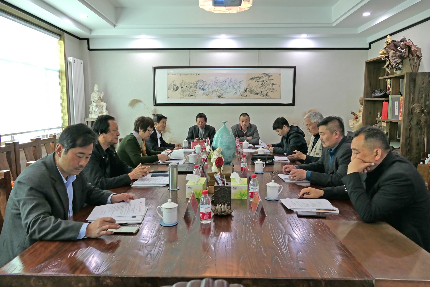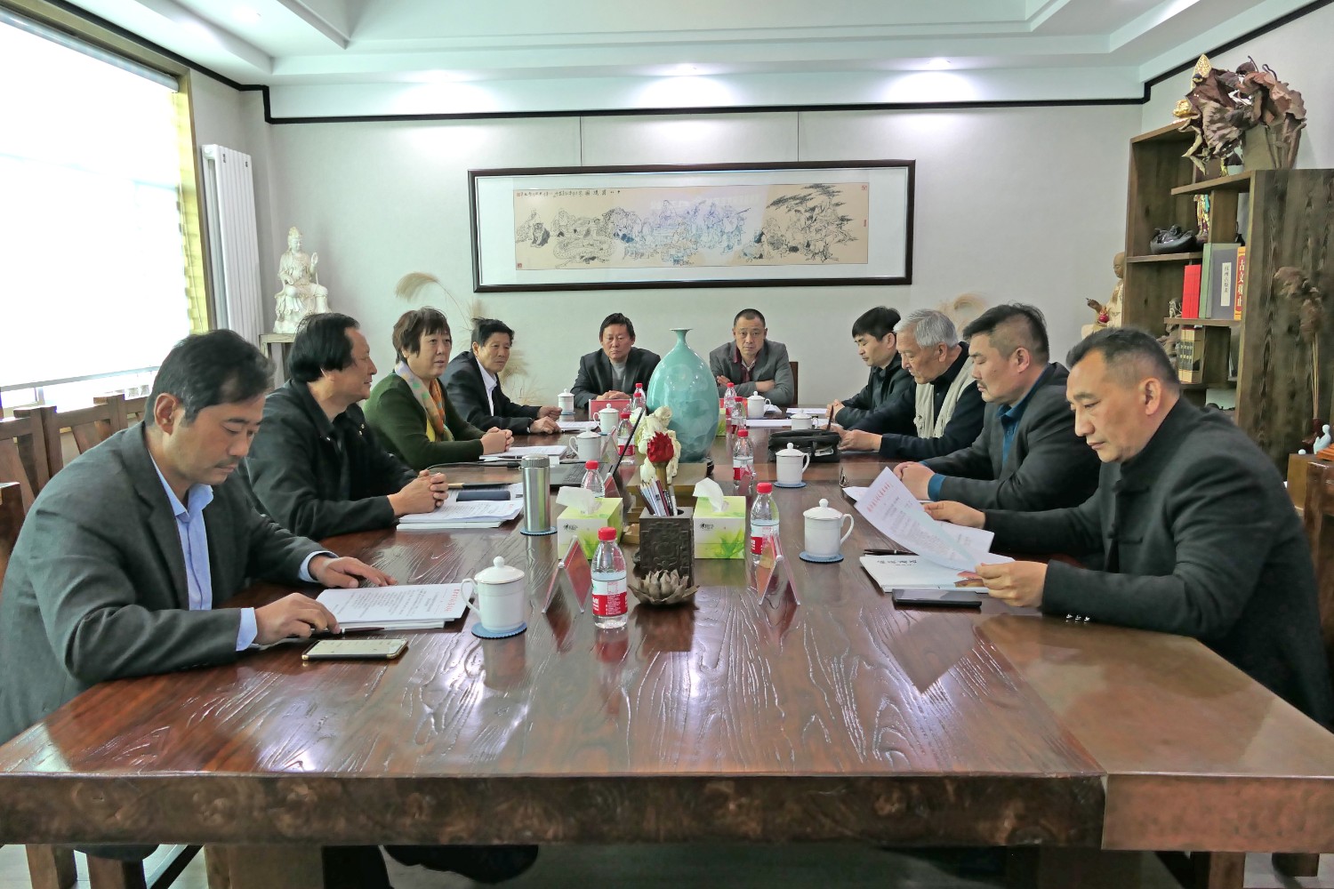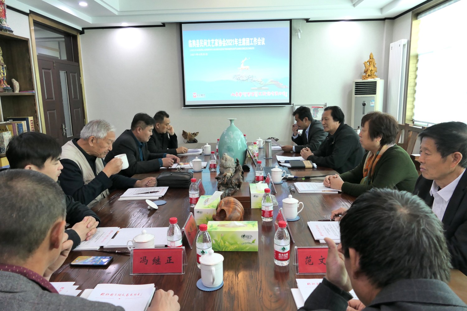 2021年4月25日“临朐县民间文艺家协会2021年主席团工作会议”在华艺雕塑二楼会议室举行。临朐县民协艺术顾问冯益汉、县民协主席傅绍相、副主席兼秘书长刘文远、副主席李志君、刘言波、连恩平、张国华、冯继正、范文刚、赵永德等主席团成员先后发言。傅绍相主持会议,主要议程:各位主席团成员汇报2020年工作情况及2021年工作计划;副主席刘文远作“2020年临朐县民间文艺家协会工作总结报告”、通报县民协2020年财务情况;主席傅绍相传达潍坊市民协2021年4月7日主席团会议精神及临朐县民协2021年工作计划,继而召开了临朐县民协党支部会议。与会人员畅所欲言,对2021年县民协工作充满信心。一致表示2021年是我国十四五开局之年,也是民间艺术在新时代、新梦想、新征程上大力发展之年,在潍坊市民协及临朐县文联的坚强领导和具体指导下,认真贯彻党的十九大和十九届二中、三中、四中、五中全会精神,大力弘扬新时代大国工匠精神,推动我县民间艺术的科技创新,积极扶持民间文艺产业,勇担时代责任、创新创意,多出民间艺术传世精品,永葆初心、凝聚共识、团结奋进、精心谋划、攻坚克难,展现县民协新形象新作为。用我们艺术的双手和精湛的民间技艺,创造出精美绝伦的民间艺术精品,向中国共产党成立一百周年奉献厚礼。