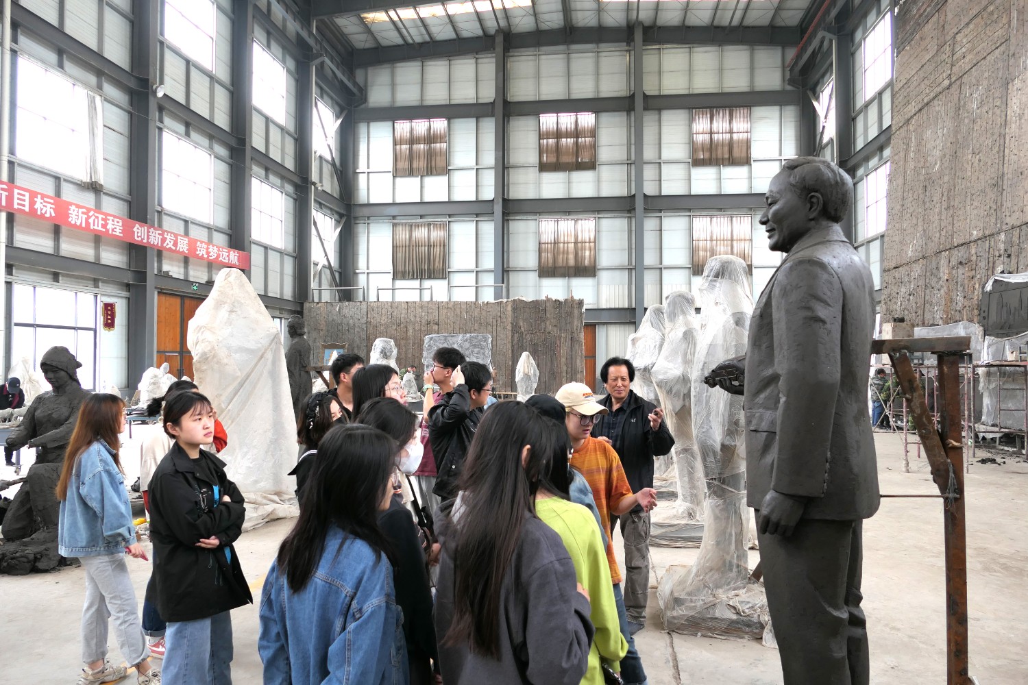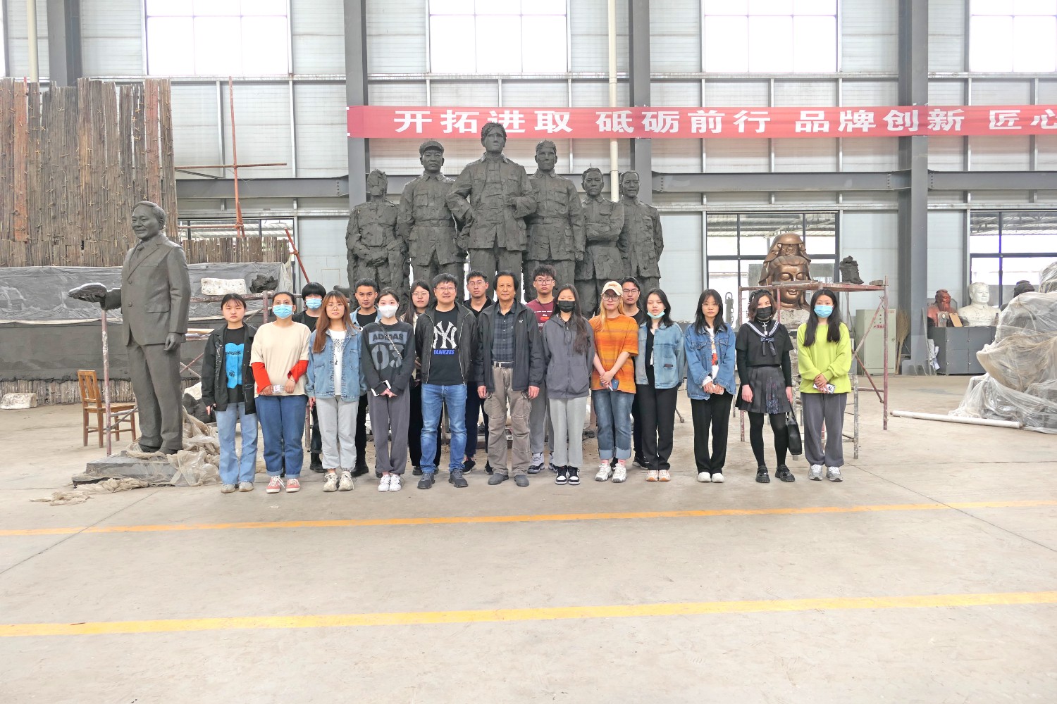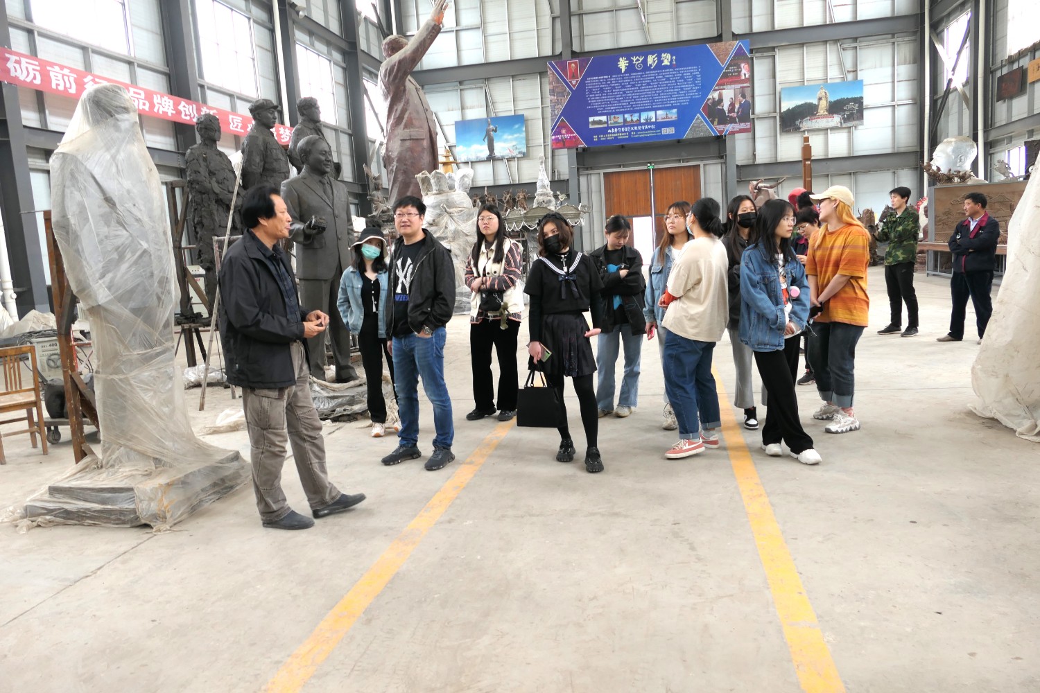 2021年4月29日,齐敬峰教授带领山东工艺美术学院公共艺术专业学生来华艺参观指导,傅绍相介绍雕塑艺术。