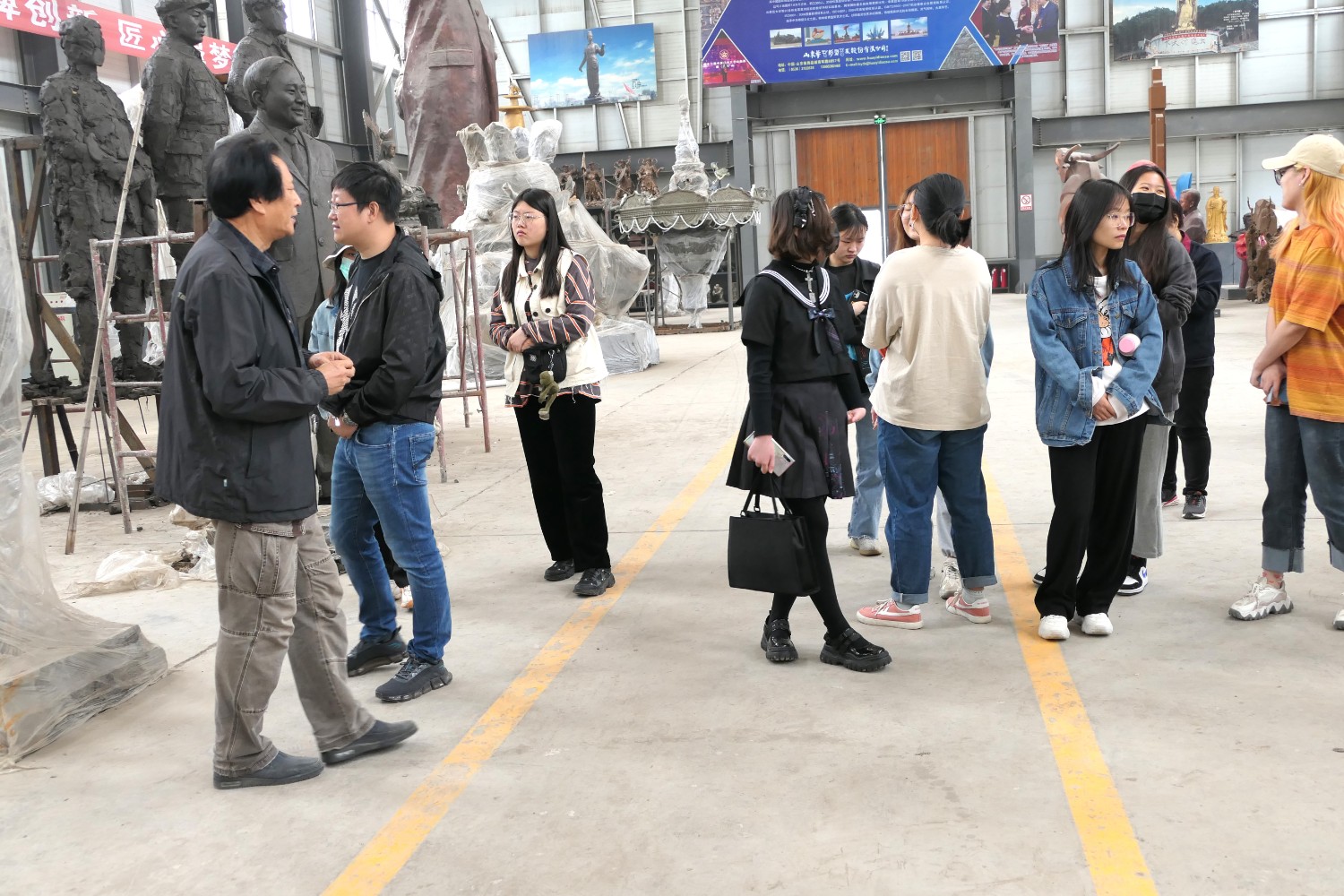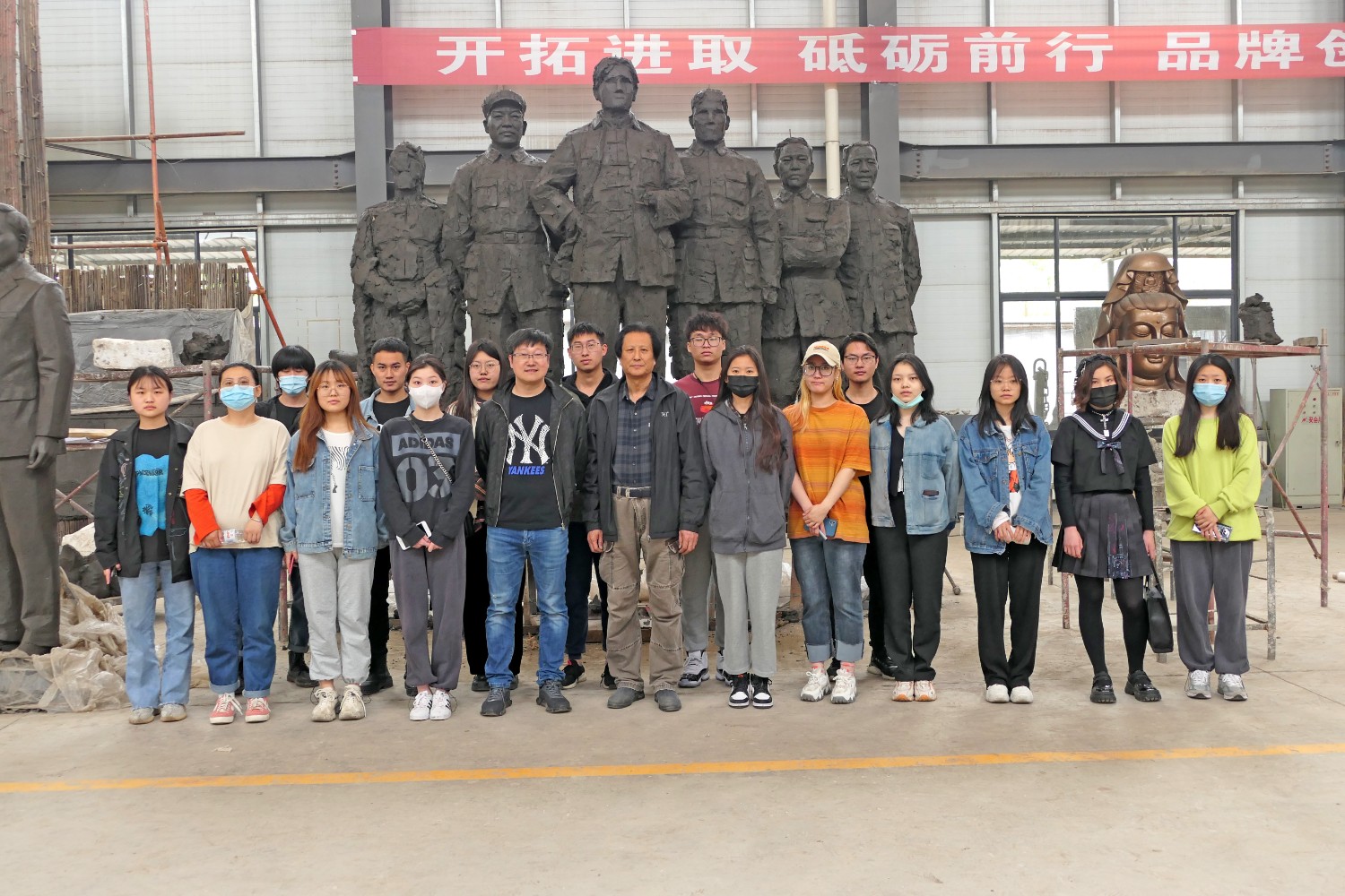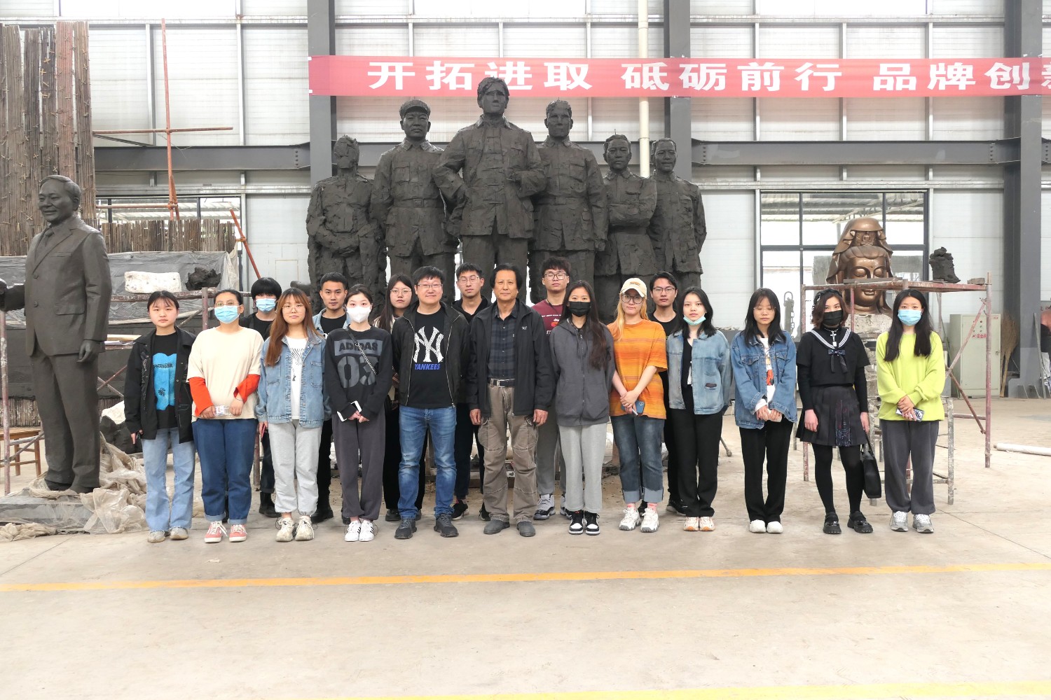 2021年4月29日,齐敬峰教授带领山东工艺美术学院公共艺术专业学生来华艺参观指导,傅绍相介绍雕塑艺术。