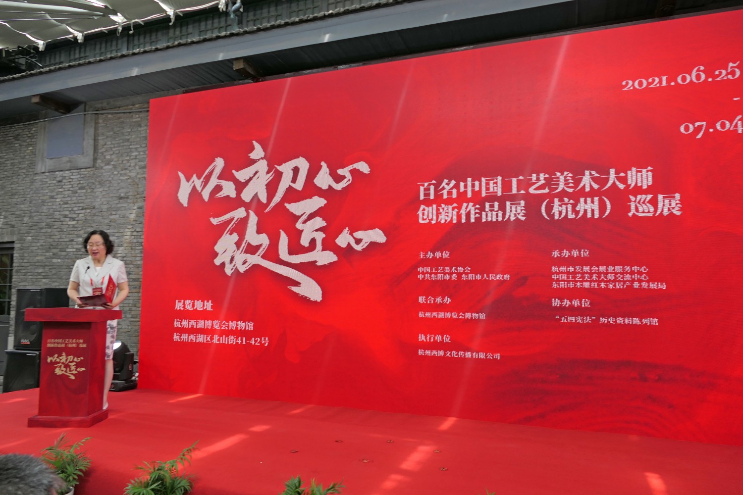 2021年6月25日,由中国工艺美术协会和中共东阳市委、东阳市人民政府共同举办的“百名中国工艺美术大师创新作品展(杭州)巡展”在杭州西湖博览会博物馆启幕。巡展以“以初心·致匠心”为主题,百名工艺美术大师发扬工匠精神,用艺术的形式礼赞百花齐放盛景,表达对国家富强,民族复兴的美好愿望。开幕仪式上,中国工艺(集团)公司副董事长、中国工艺美术协会常务副会长张红致辞,东阳市副市长黄阳明致辞。中国工美行业艺术大师傅绍相应邀参加此次展览,青铜雕塑作品《为人民服务》获大家的好评。