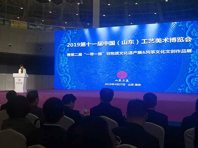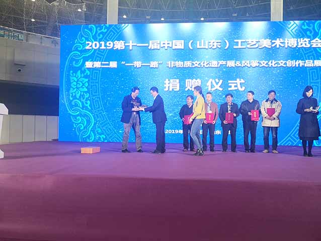 2019年4月27日—5月1日,2019第十一届中国(山东)工艺美术博览会暨第二届“一带一路”非物质文化遗产展风筝文化文创产品展,在潍坊市富华会展中心隆重举行,华艺雕塑组织雕塑精品参加展览,其中“一带一路·和平之路”被评为山东工美2017/2018年度精品奖。 风筝文化文创作品“龙腾鸢都”印章荣获中国(潍坊)风筝文化创意设计大赛二等奖。