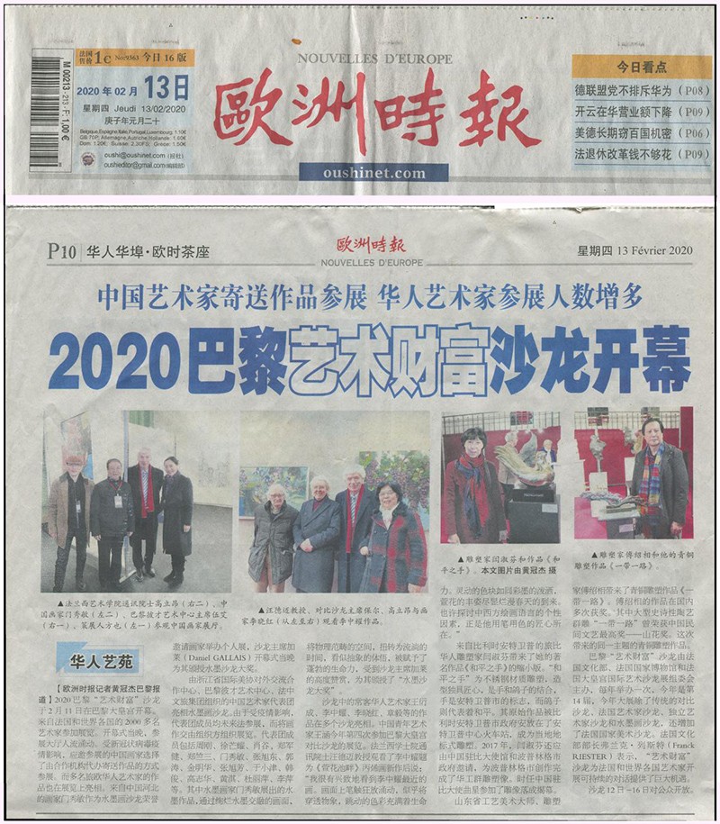 2020-10-42020年2月12日至18日,世界艺术协会在巴黎大皇宫举行第135届国际艺术独立沙龙展”。傅绍相作品《一带一路·和平之路》应邀参加展览。来自法国和世界各国的2000多位艺术家参加了2月12日在大皇宫的开幕式,多名旅欧华人艺术家的作品也在展览上亮相。展会期间傅绍相接受了《欧洲时报》记者黄冠杰采访,并与多名国外艺术家进行了交流,继而参观了卢浮宫、凡尔赛宫、凯旋门、巴黎圣母院、蓬皮杜艺术中心、奥赛博物馆、罗丹博物馆、埃菲尔铁塔、协和广场、拉德芳斯及香榭丽舍大街等巴黎著名的风景区。每一处艺术圣地,游人如织,精美的艺术作品、精湛的欧式建筑、世界顶尖的艺术殿堂,令人叹为观止。
