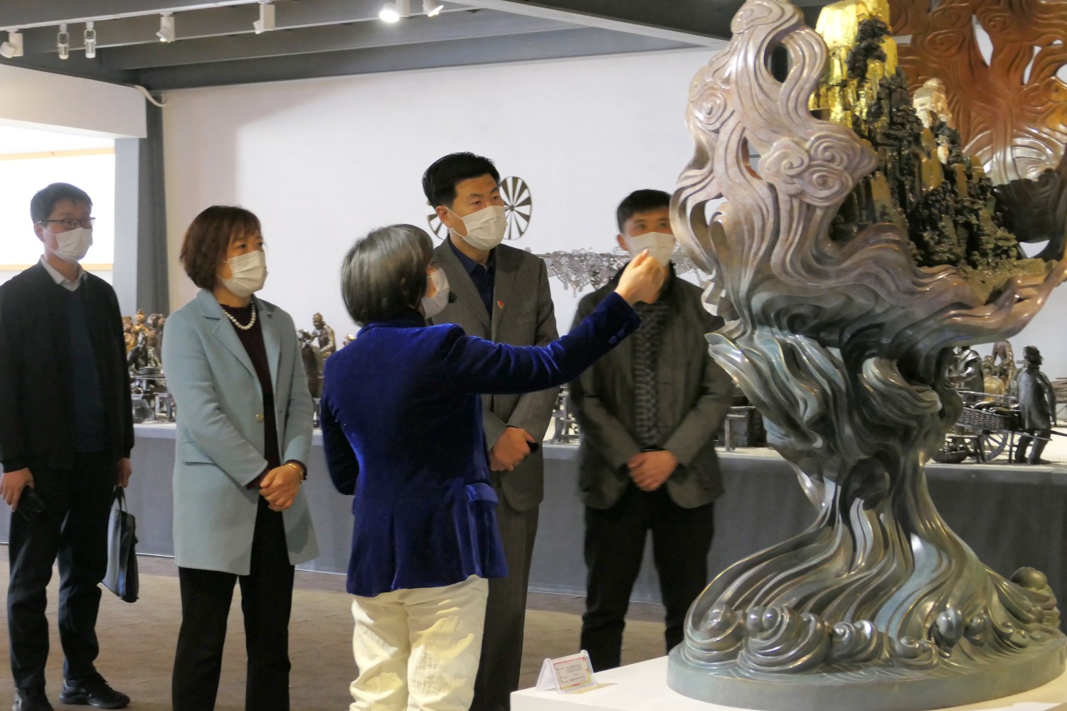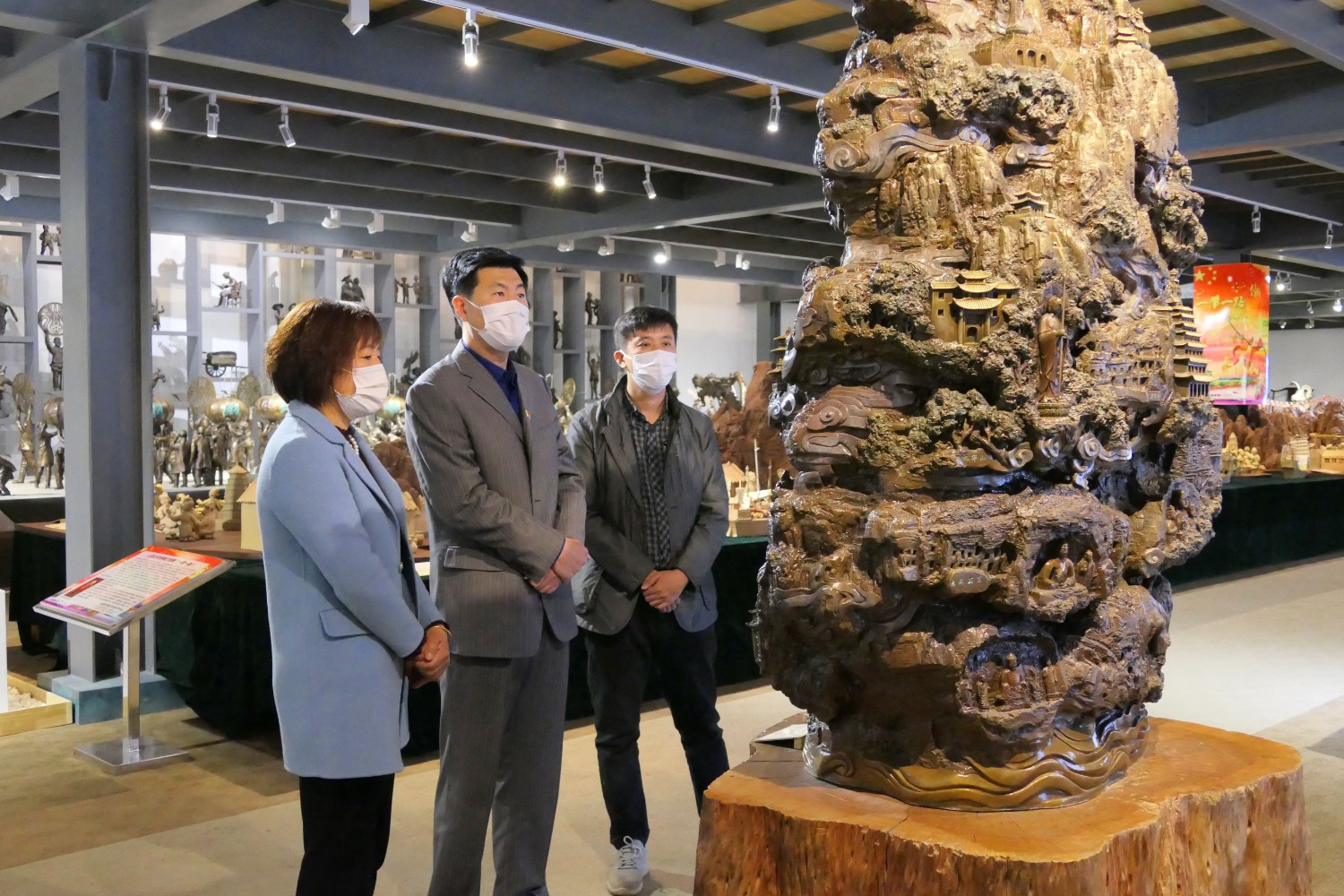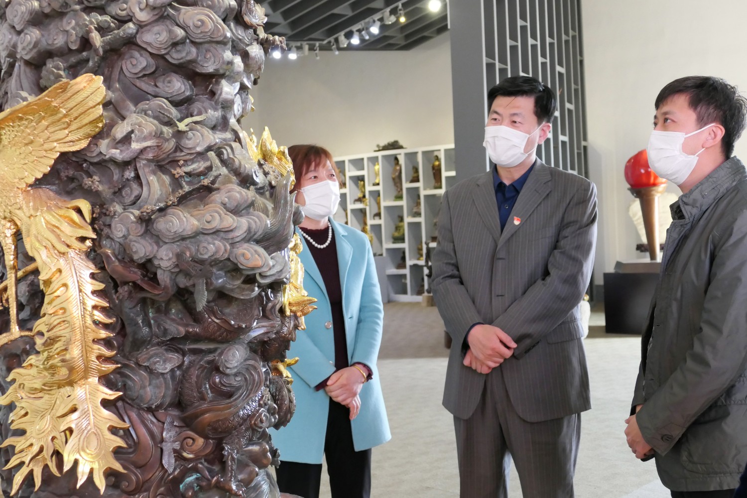 2020年3月17日,省派临朐县“四进”工作组山东工艺美术学院韩世春副院长一行来华艺雕塑参观指导。城关街办郭建玲副主任陪同,傅绍相介绍华艺雕塑发展情况。