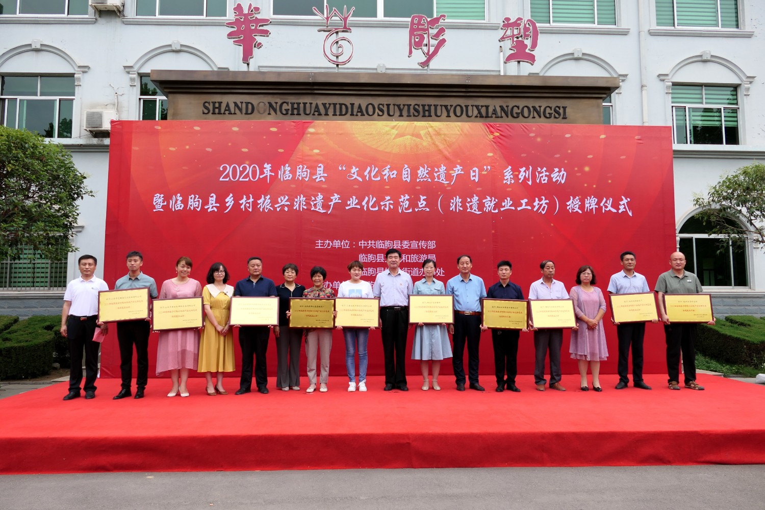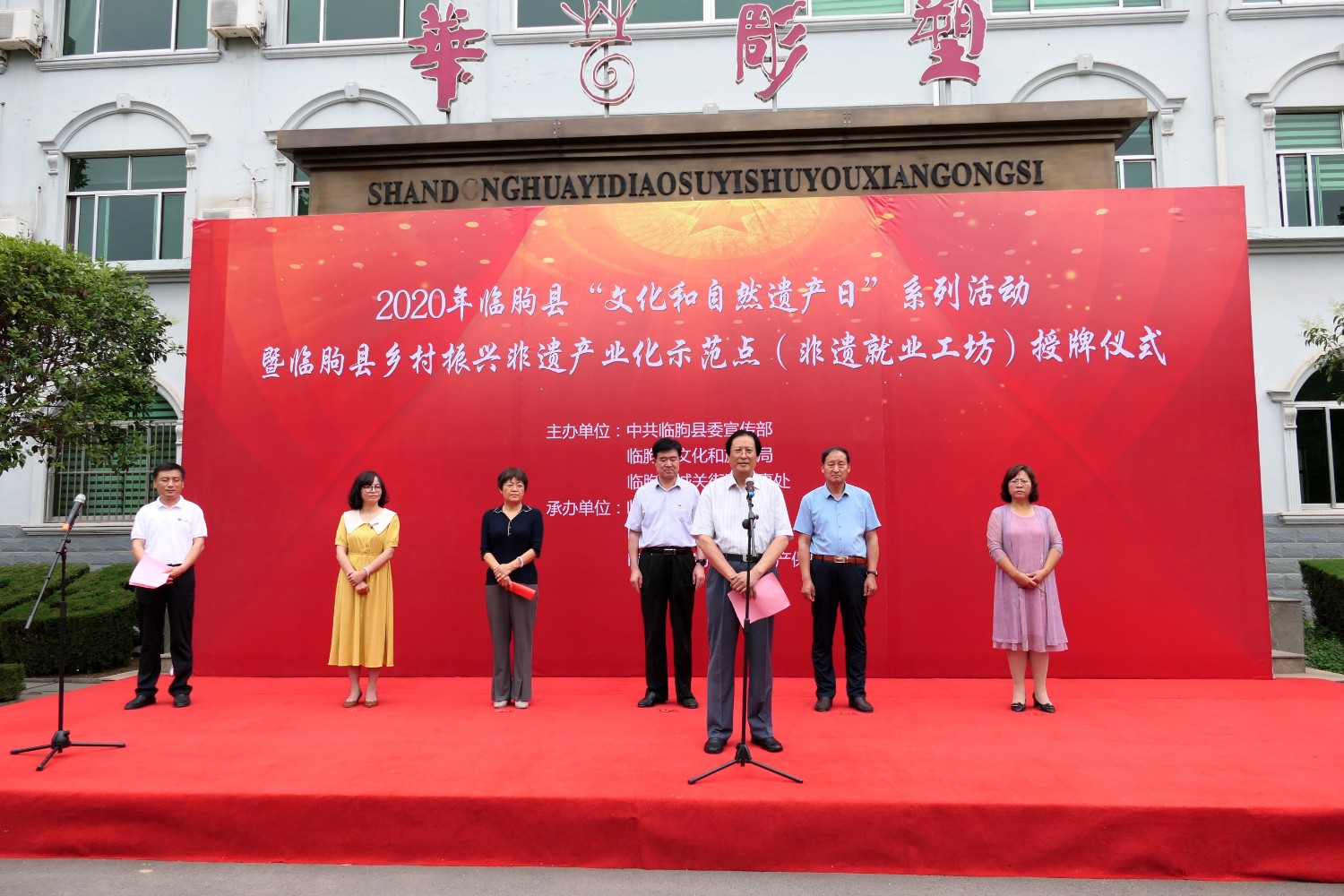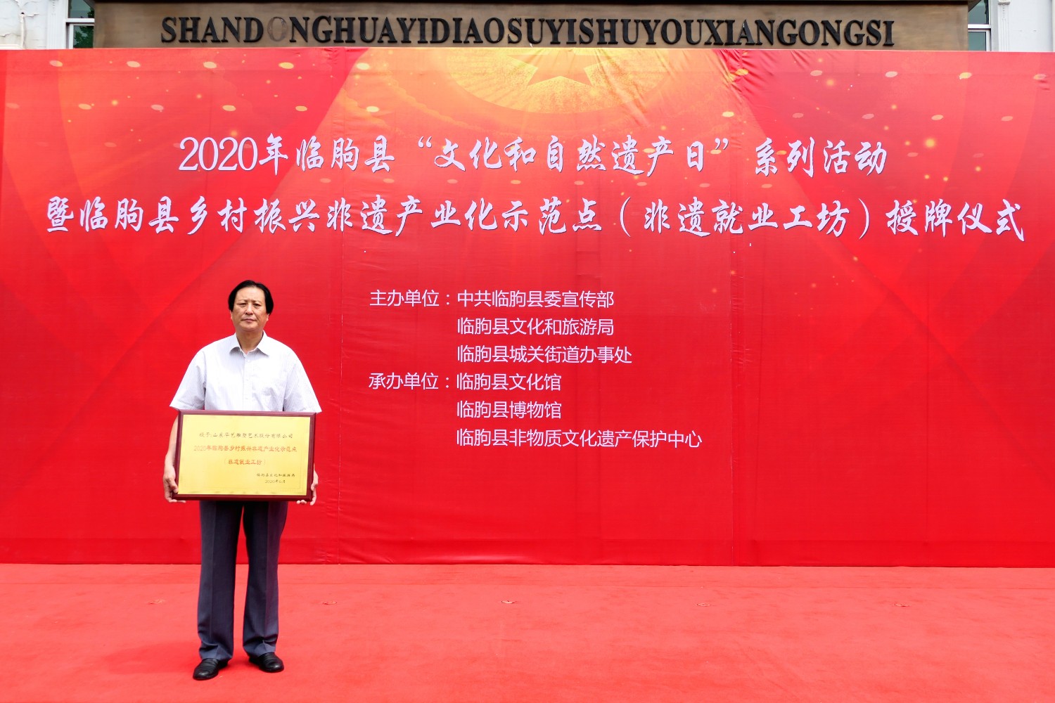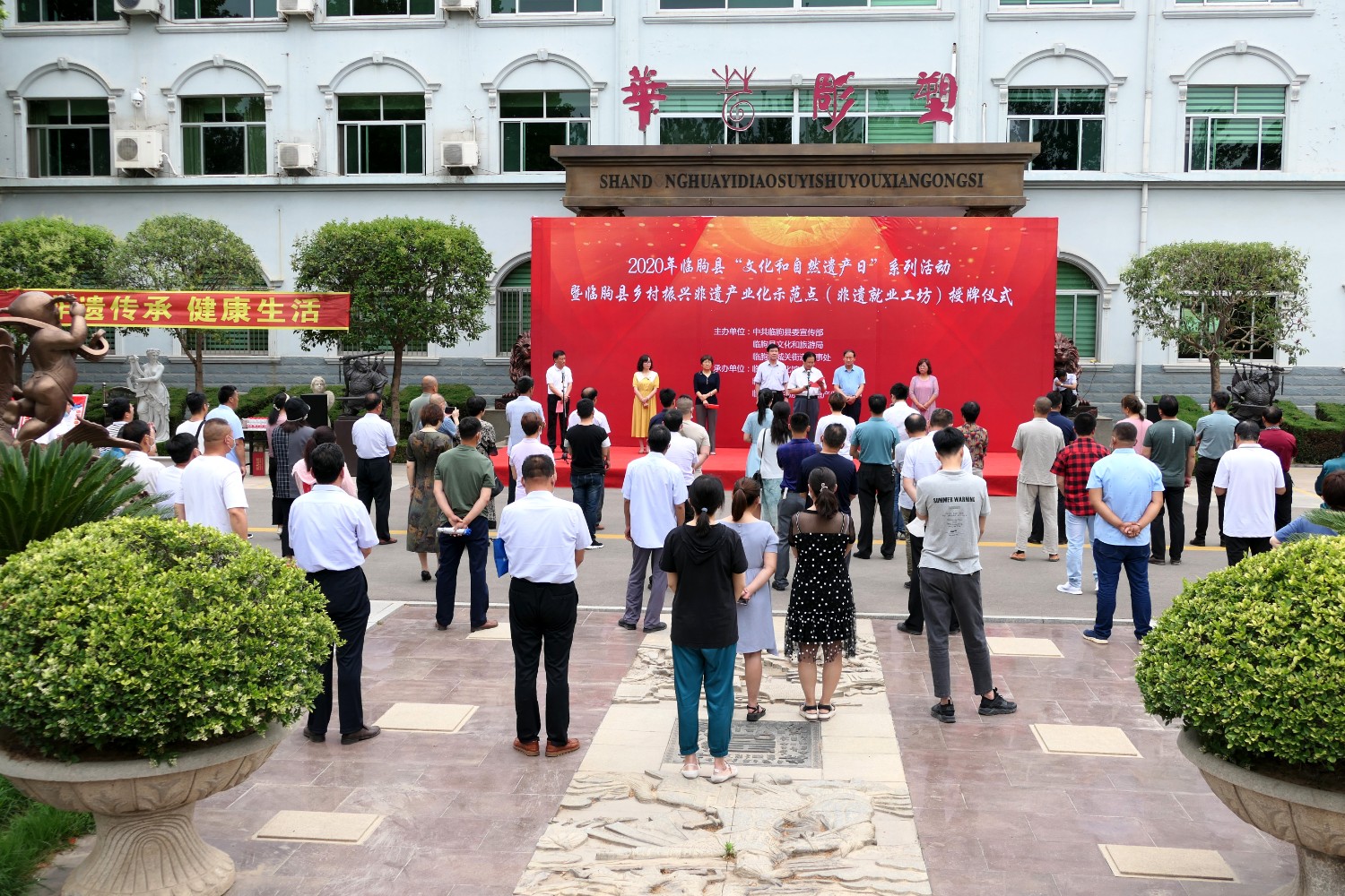 2021-2-22020年6月12日,2020年临朐县“文化和自然遗产日”系列活动暨临朐县乡村振兴非遗产业化示范点(非遗就业工坊)授牌仪式,在华艺雕塑办公楼前隆重举行。临朐县文化和旅游局杨维政局长主持,临朐县政府党组成员分管文化和旅游的副县长沈明新、城关街办尹德忠副主任等领导出席活动仪式,华艺雕塑傅绍相致辞,主席台领导分别向华艺雕塑及其他单位和个人非遗示范点授牌。尔后,与会人员参观华艺雕塑馆及3D体验中心等。华艺雕塑的精湛技艺、精美的雕塑作品,赢得了各位嘉宾的高度赞誉。