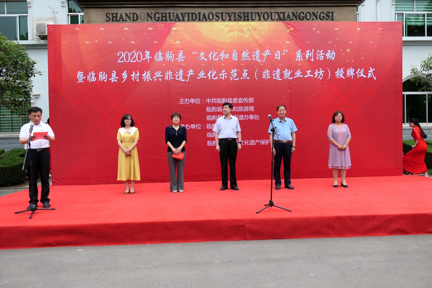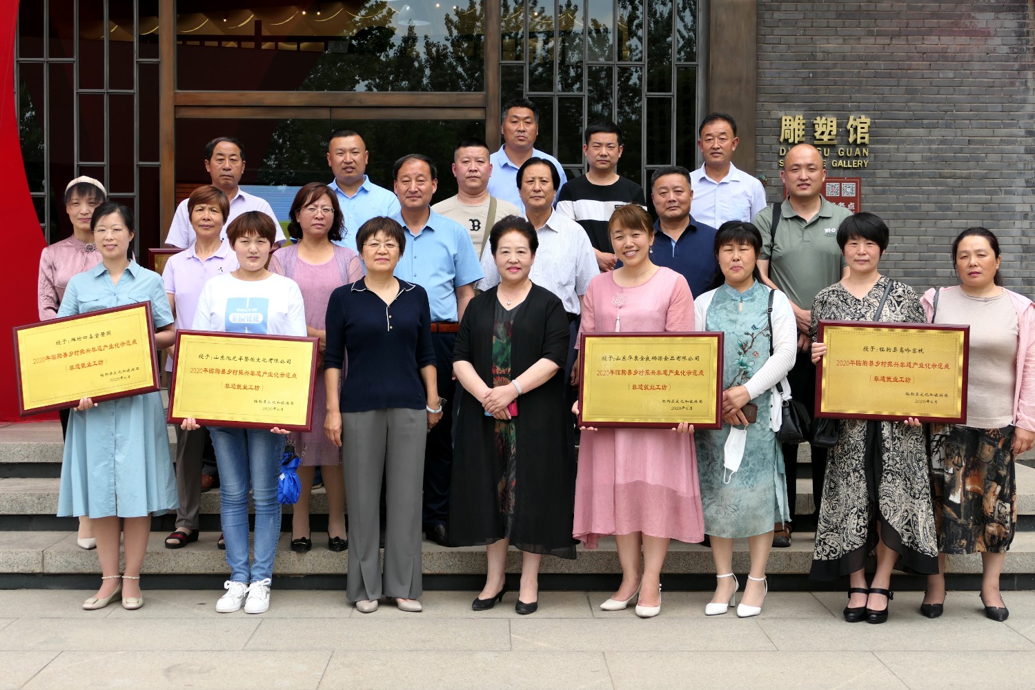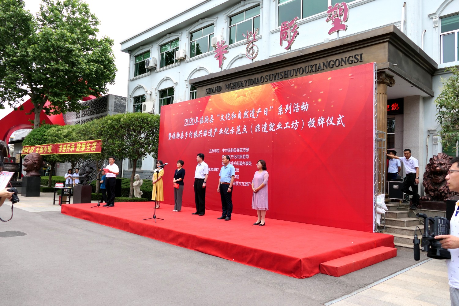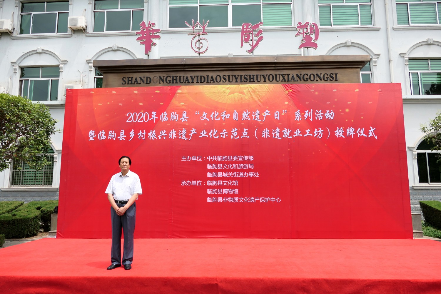 2021-2-22020年6月12日,2020年临朐县“文化和自然遗产日”系列活动暨临朐县乡村振兴非遗产业化示范点(非遗就业工坊)授牌仪式,在华艺雕塑办公楼前隆重举行。临朐县文化和旅游局杨维政局长主持,临朐县政府党组成员分管文化和旅游的副县长沈明新、城关街办尹德忠副主任等领导出席活动仪式,华艺雕塑傅绍相致辞,主席台领导分别向华艺雕塑及其他单位和个人非遗示范点授牌。尔后,与会人员参观华艺雕塑馆及3D体验中心等。华艺雕塑的精湛技艺、精美的雕塑作品,赢得了各位嘉宾的高度赞誉。