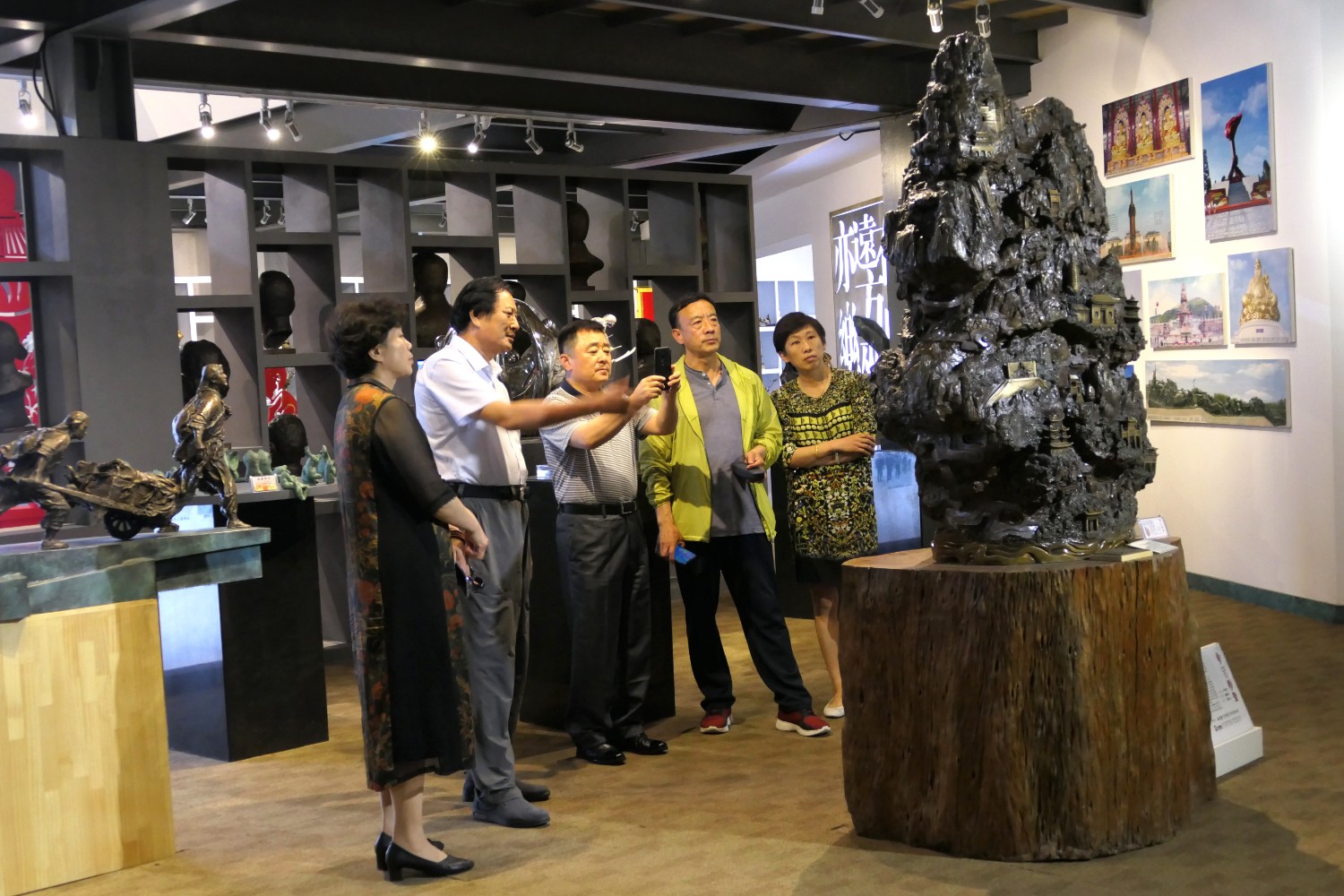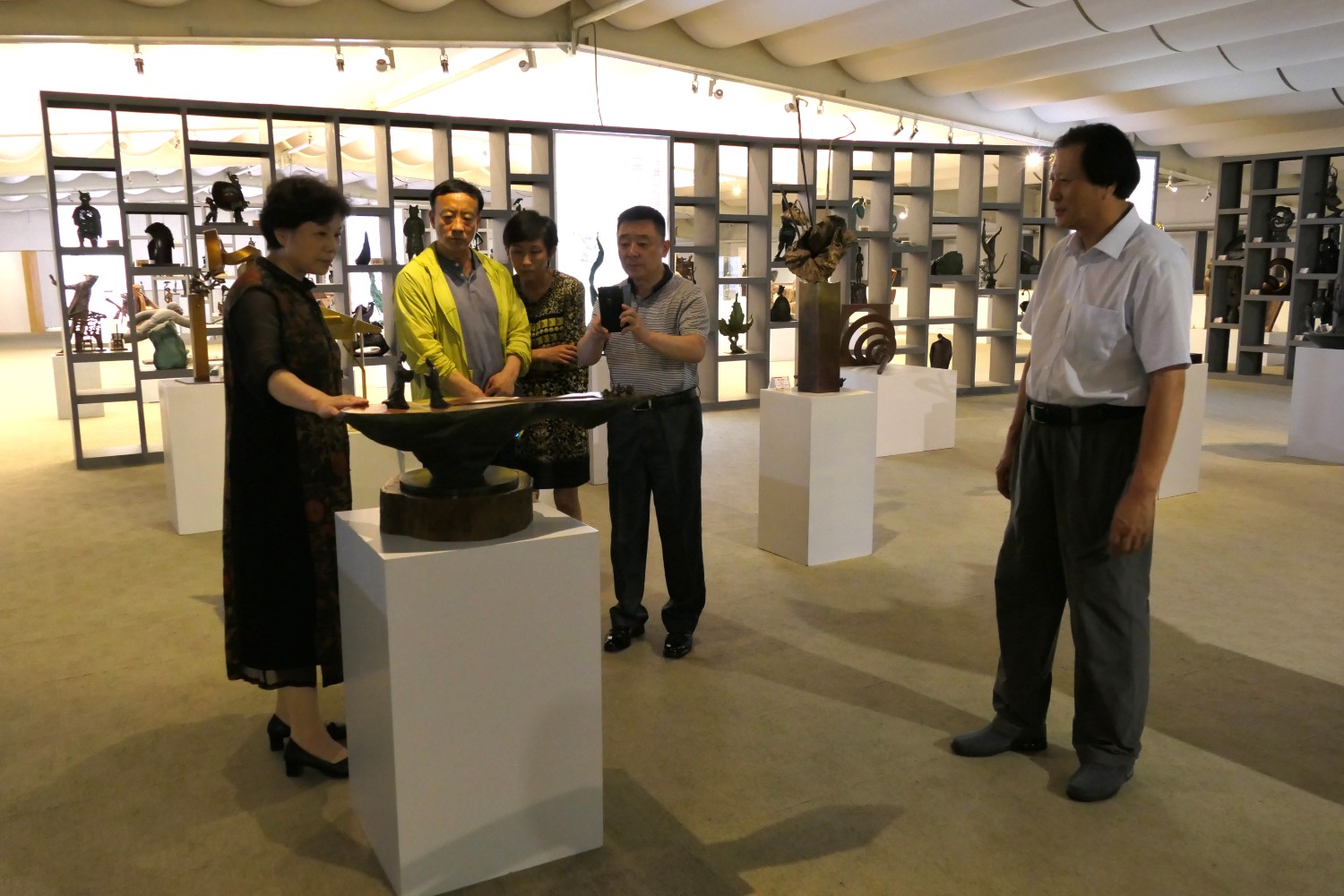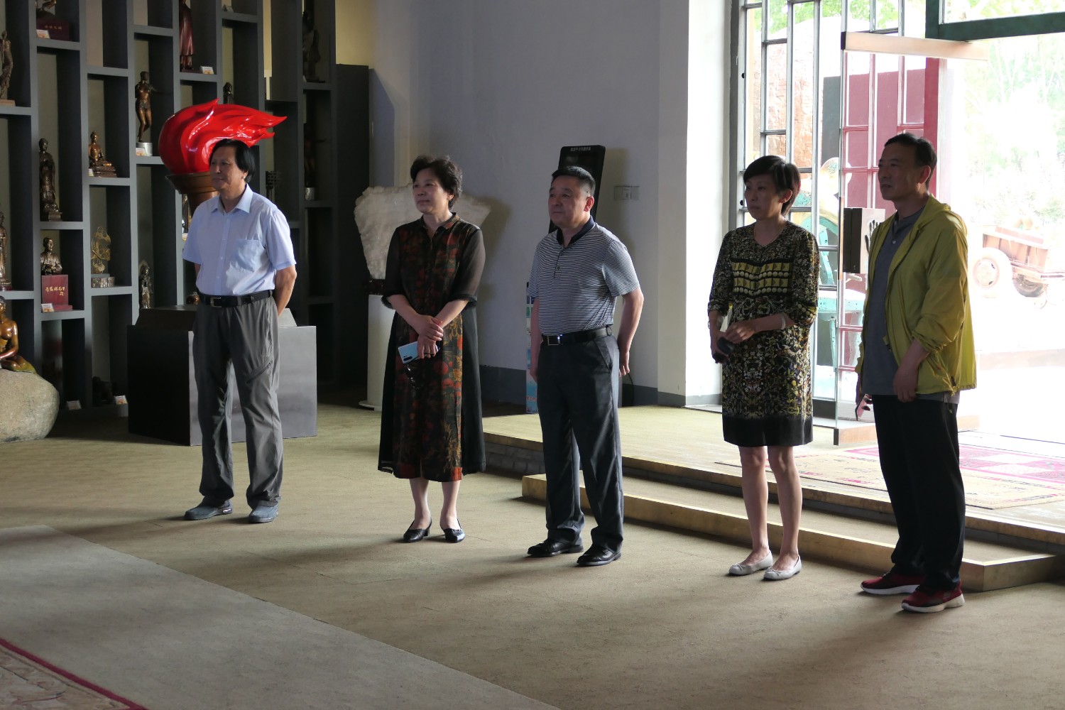 2020年6月27日济南阳光保险葛斌总经理、淄博四合美术馆王丽君馆长、青岛客人金砚先生等一行莅临华艺参观指导,傅绍相介绍雕塑艺术。