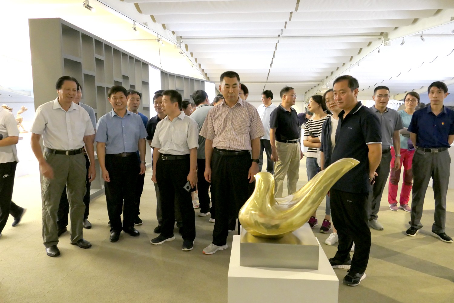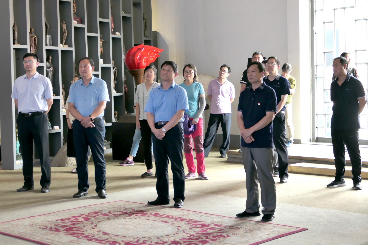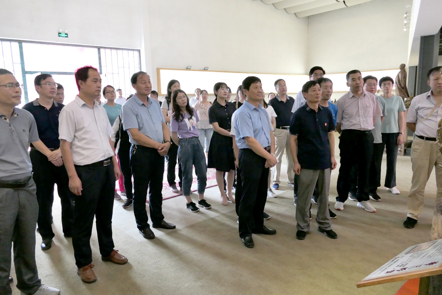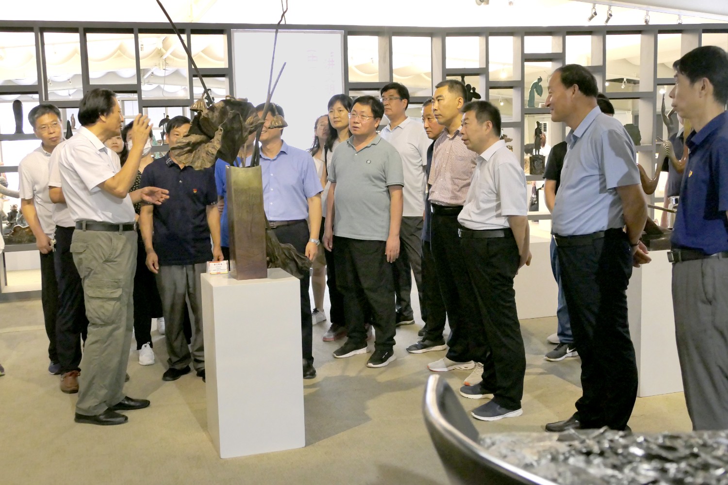 2020年7月14日临朐党校王军校长陪同潍坊市委党校副校长裴红一行50余人来临朐“党校教育”现场观摩,莅临华艺雕塑参观指导。
