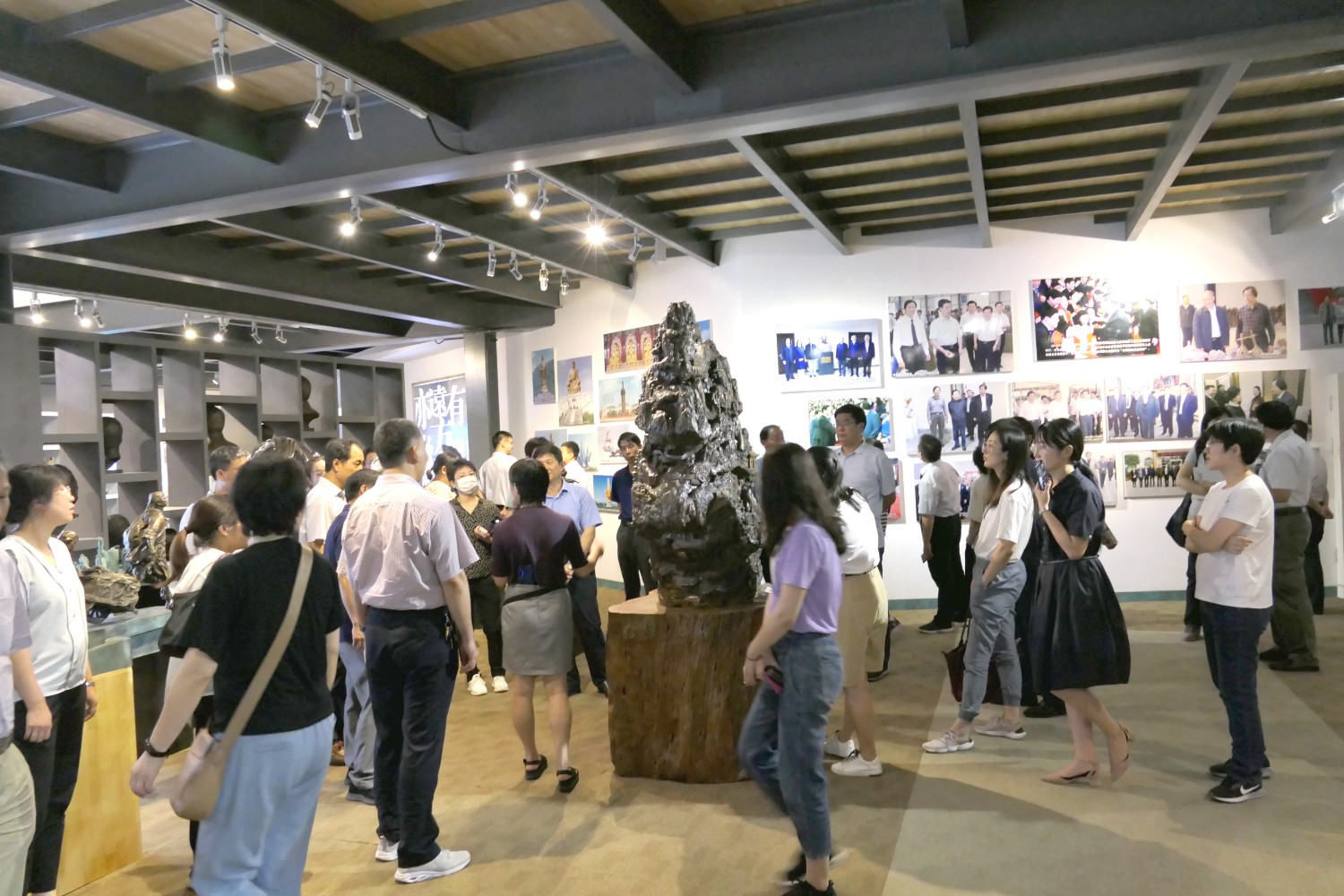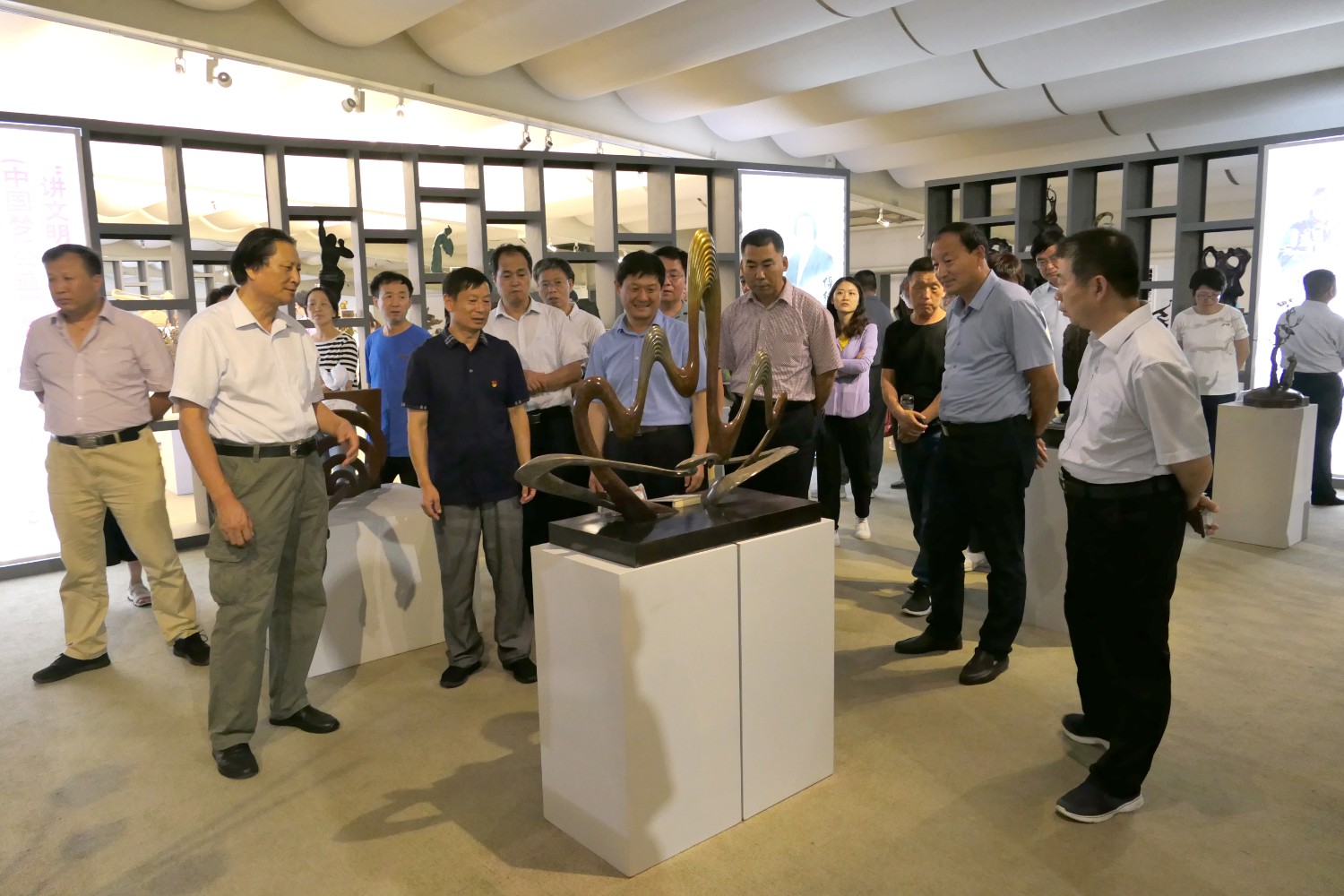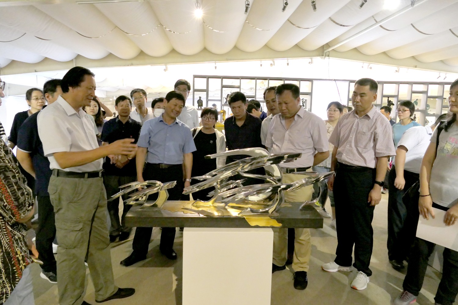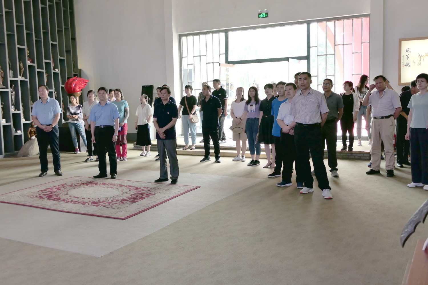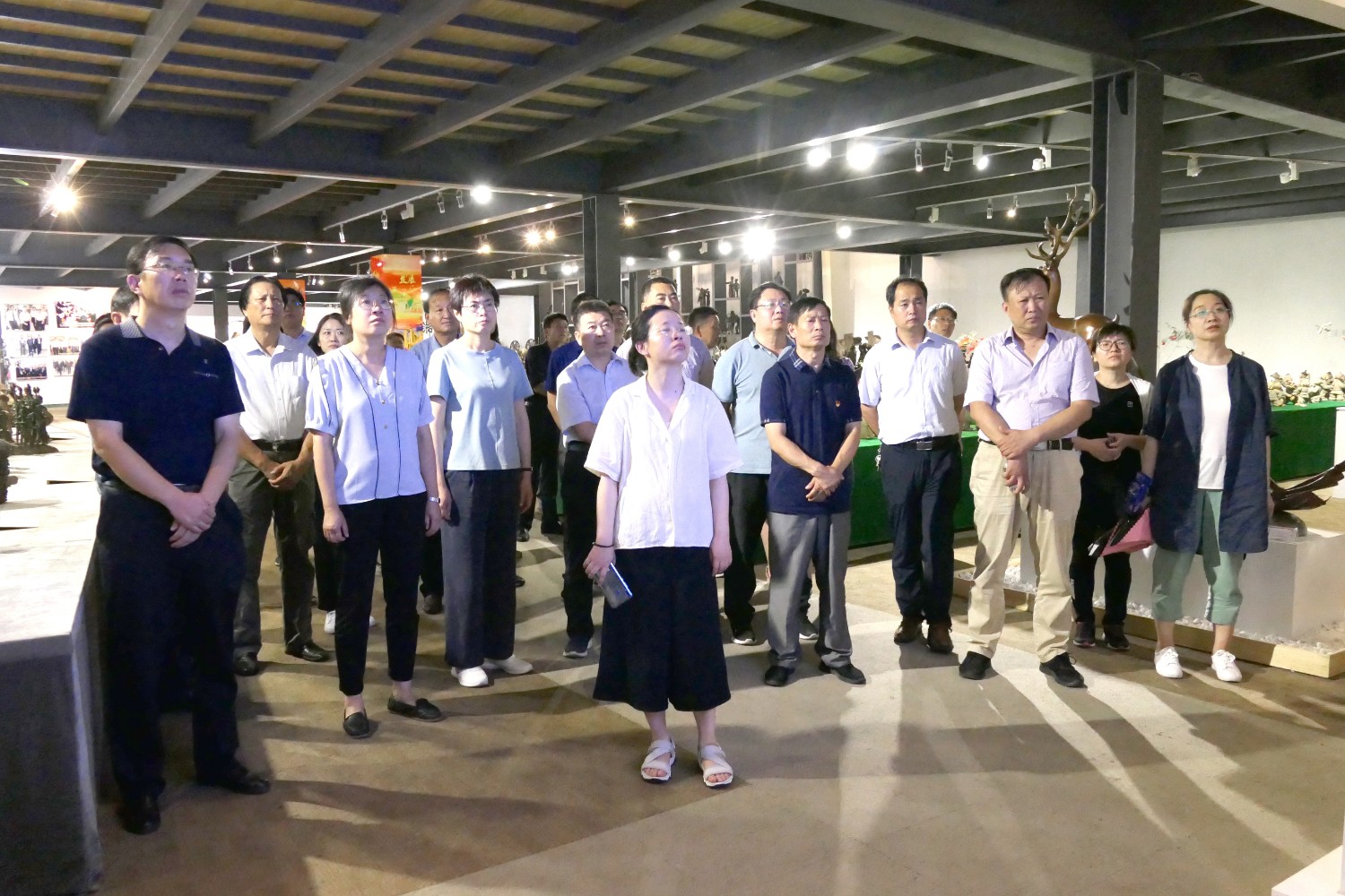 2020年7月14日临朐党校王军校长陪同潍坊市委党校副校长裴红一行50余人来临朐“党校教育”现场观摩,莅临华艺雕塑参观指导。