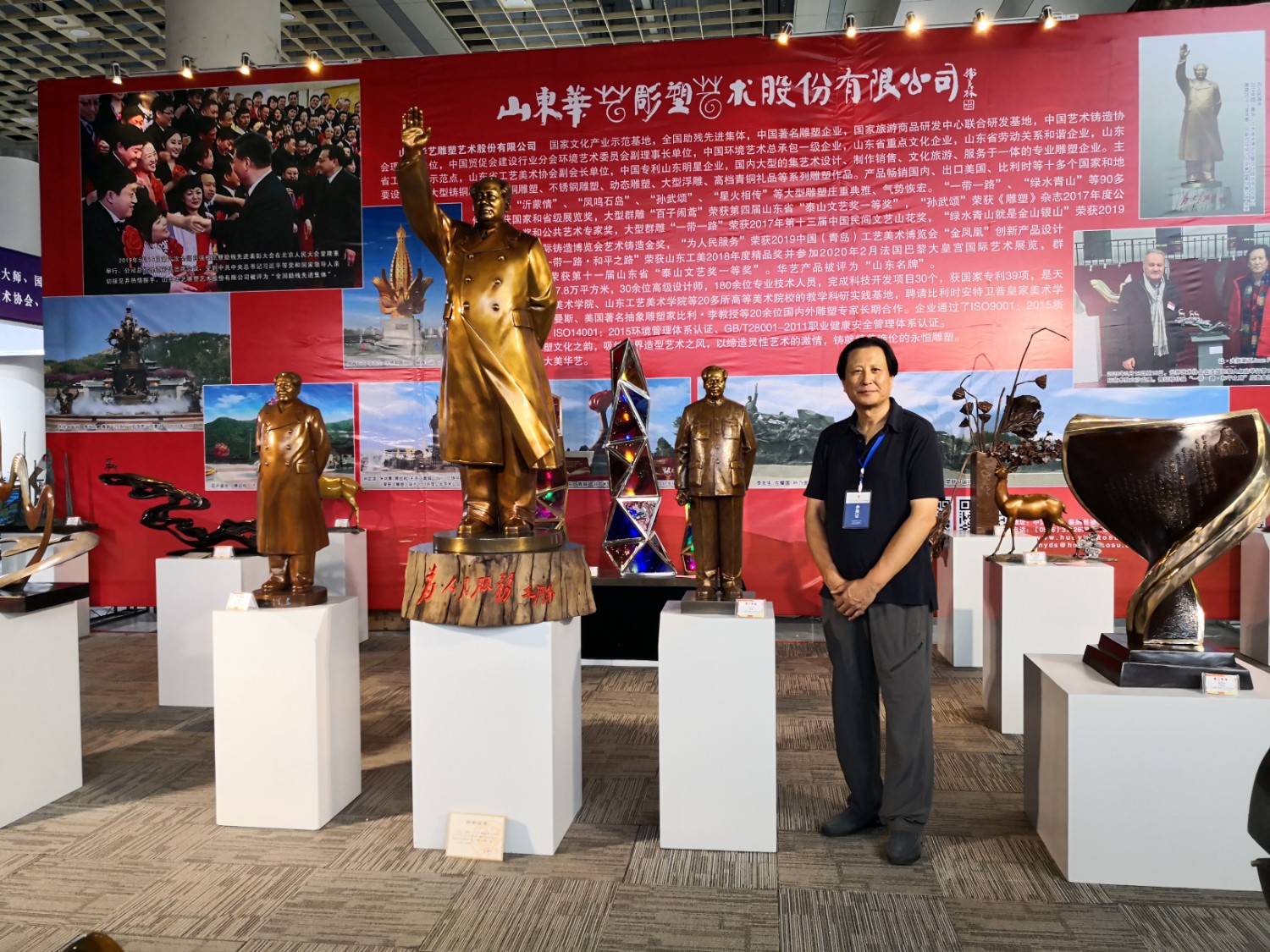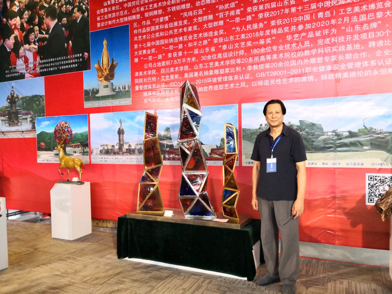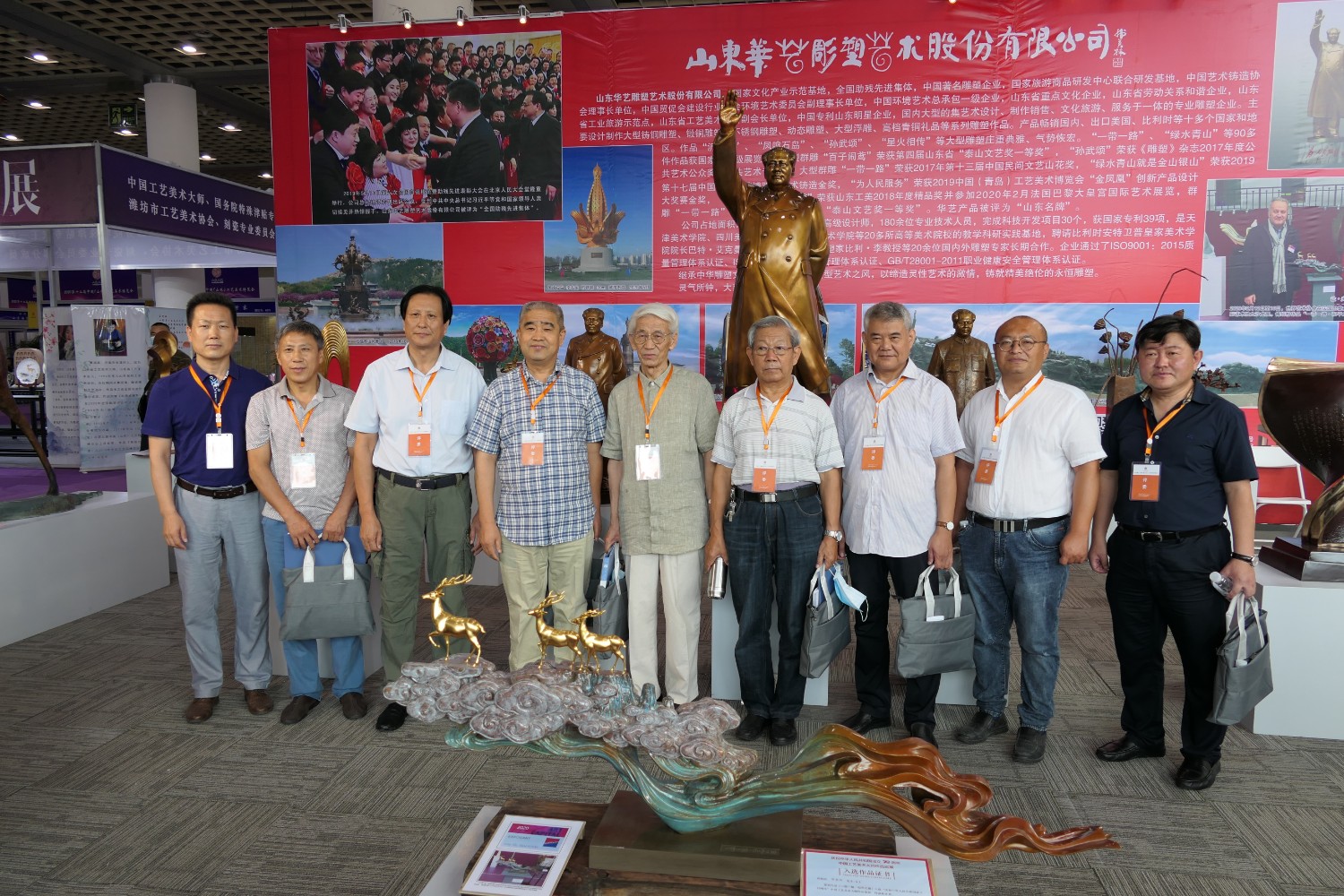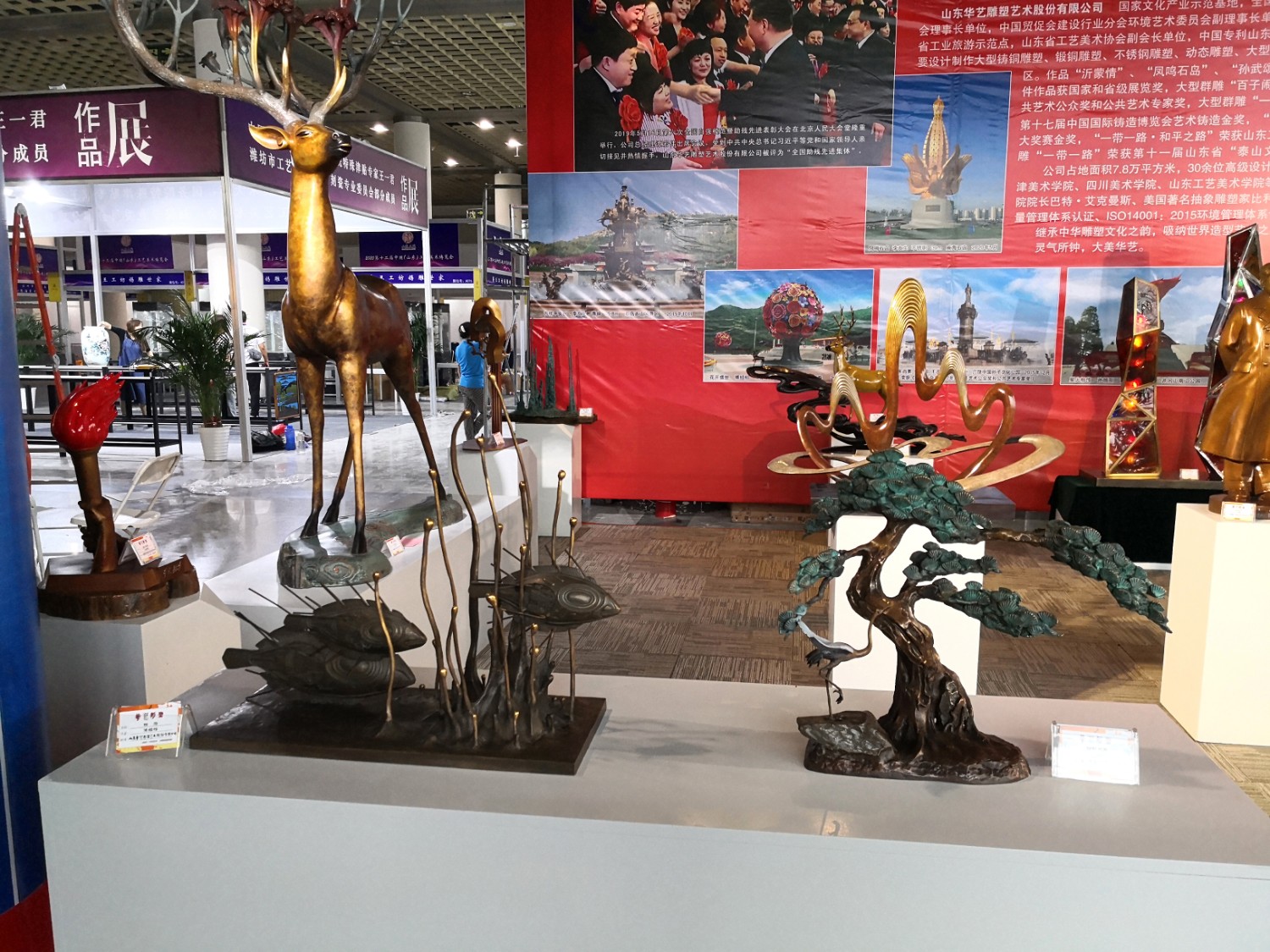 2021-2-32020年7月23日由山东省工艺美术协会、山东省工艺美术学会、山东省工艺美术研究所主办的“2020第十二届中国(山东)工艺美术博览会”在济南舜耕国际会展中心盛大开幕,出席本次开幕式的有山东省残疾人联合会一级巡视员张志超,山东省工业和信息化厅二级巡视员张忠军,山东省轻工集体企业联社党组成员、监事会主任柴本成,山东省文学艺术界联合会党组成员、副主席姜慧,山东省工业技师学院党委书记孙科顺,山东省财政厅总经济师文毅,民建山东省委副主委、山东省拍卖行业协会会长李伟,山东省市场监督管理局质量发展处一级调研员高青,淄博市委宣传部副部长、二级调研员荣先锋,山东省文化和旅游厅非遗处副处长蒋士秋,山东省轻工纺织工会委员会副主席匙涛,山东省工艺美术学会会长傅绍相等领导及嘉宾。山东省工艺美术协会会长袁敏主持开幕式。本届展会由山东省工艺美术协会、山东省工艺美术学会、山东省工艺美术研究所共同主办,有关省市工艺美术协会、各市工艺美术协会(学会)、省工艺美术协会各专业委员会(分会)协办,山东省工艺美术协会、山东省工艺美术学会、山东省工艺美术研究所承办。华艺雕塑精选81件作品参加展览,其中傅绍相作品《绿水青山》荣获山东工美年度精品奖,傅绍相作品《琉光璃韵》荣获“泰山桃木王”杯设计创新奖金奖;傅东作品《鹿鸣吉祥》荣获“泰山桃木王”杯设计创新奖金奖;牛运强作品《凝聚》荣获“泰山桃木王”杯设计创新奖金奖;傅思涵作品《鹿鹤同春》荣获“泰山桃木王”杯设计创新奖金奖;谭炳作品《飞武汉战疫情》荣获“泰山桃木王”杯设计创新奖金奖。